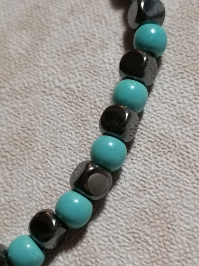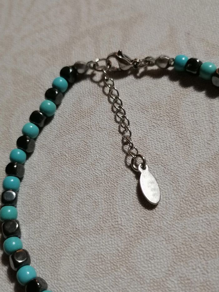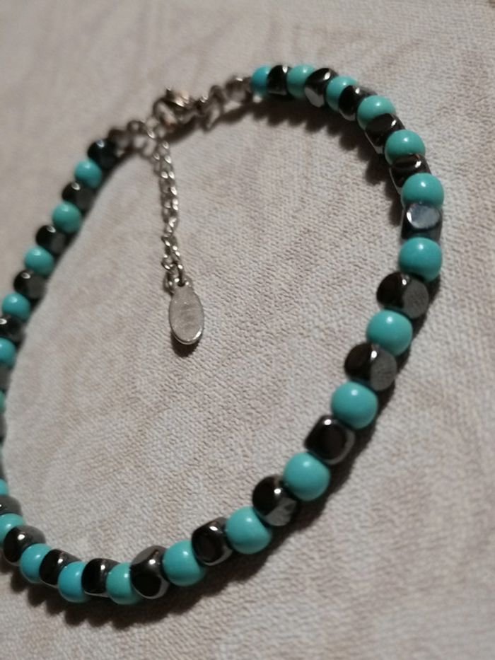 Joli bracelet avec ses véritables perles en Turquoise bleu et ses petites perles en hématite noires. 18 cm. Autre taille sur demande