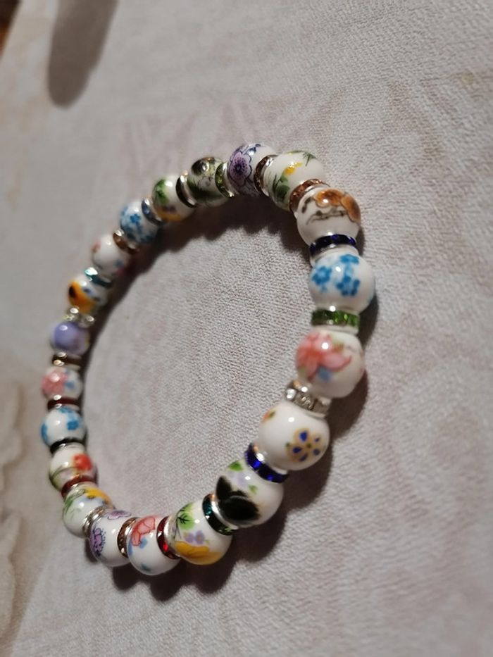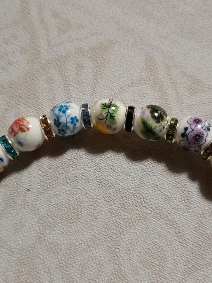 Jolie bracelet élastique avec ses jolies petites perles en céramique fleuries et ses petits strass. 18 cm. Autre taille sur demande