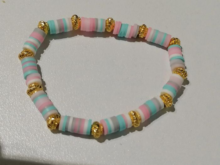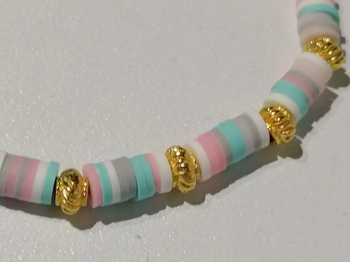 Bracelet élastique avec ses perles heishi colorées pastel et ses petites perles dorées. 18 cm. Autre taille sur demande