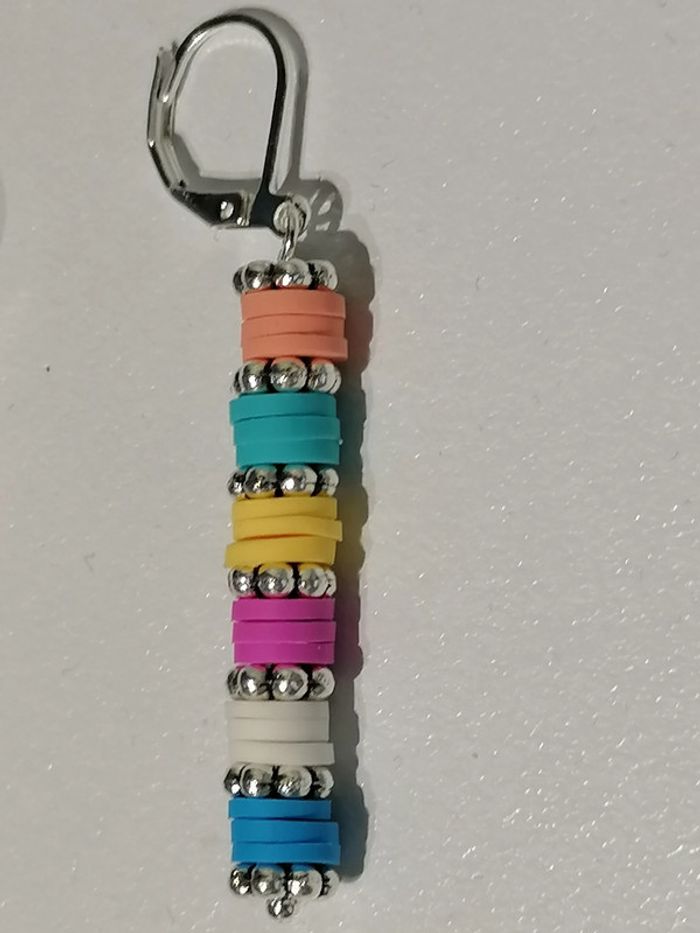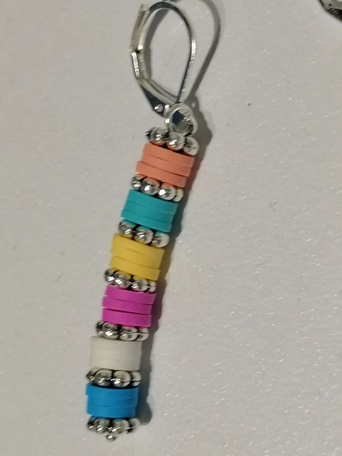 Boucles d'oreilles pendentif avec ses petites perles heishi colorées. Dormeuse argenté.