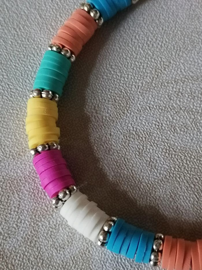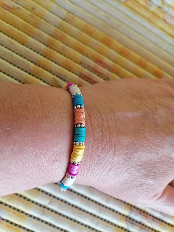 Bracelet et ses jolis perles heishi colorées et ses petites perles fleurs entretoises. 18cm. Autre taille sur demande