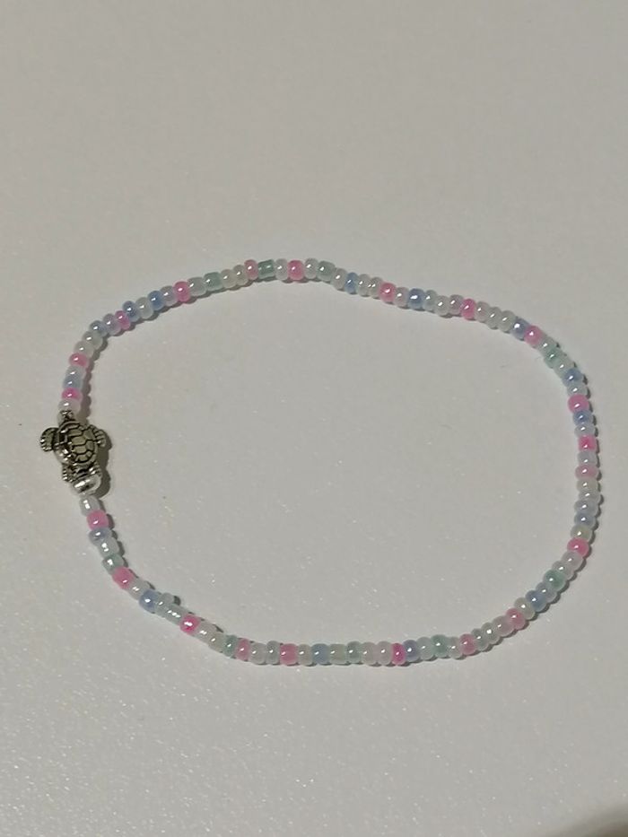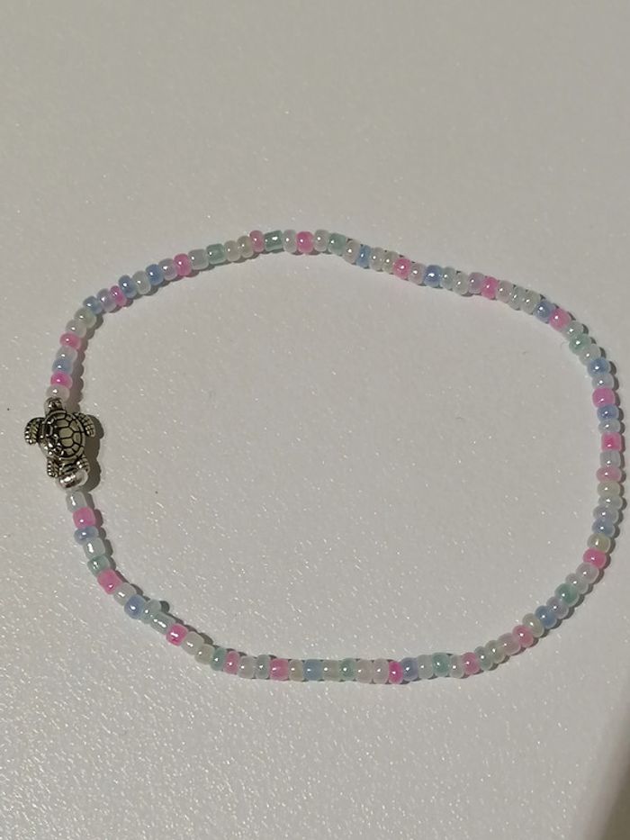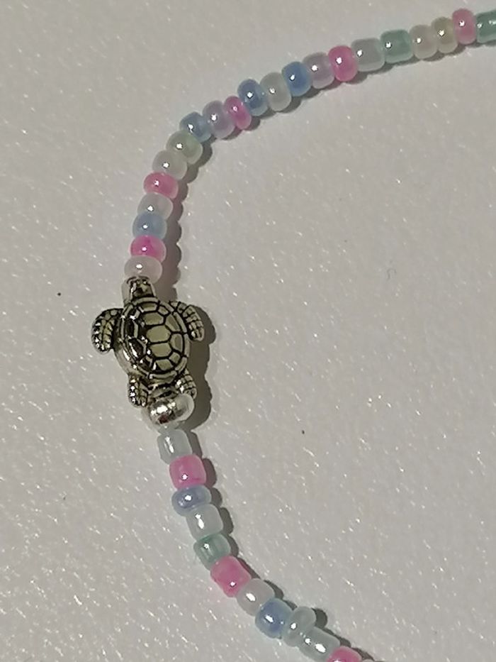 Bracelet fin. Jolies couleurs pastels et sa petite tortue argenté. 18 cm. Autre taille sur demande.