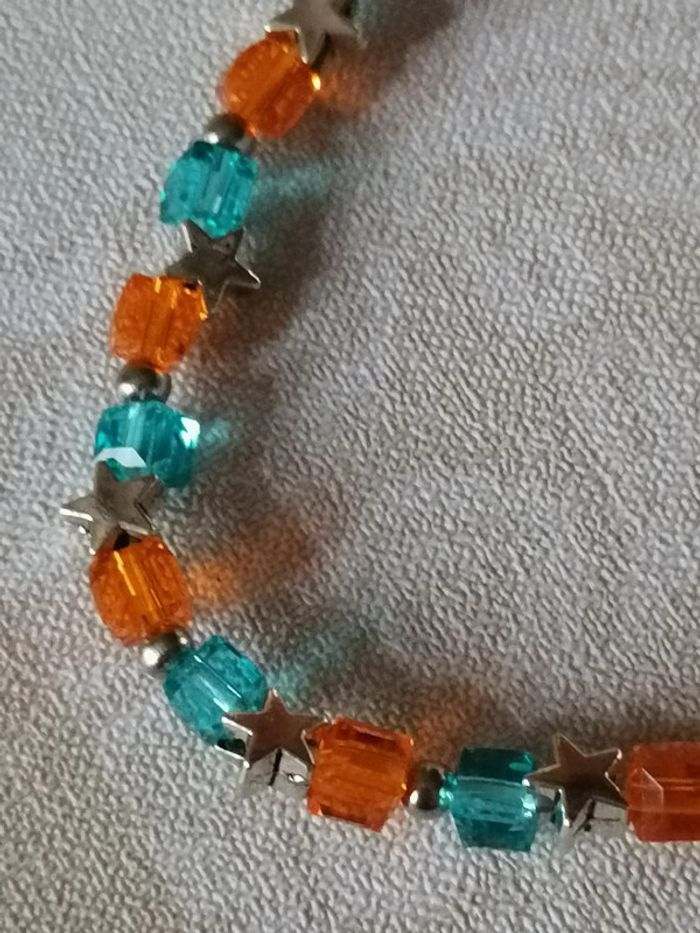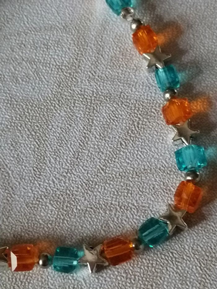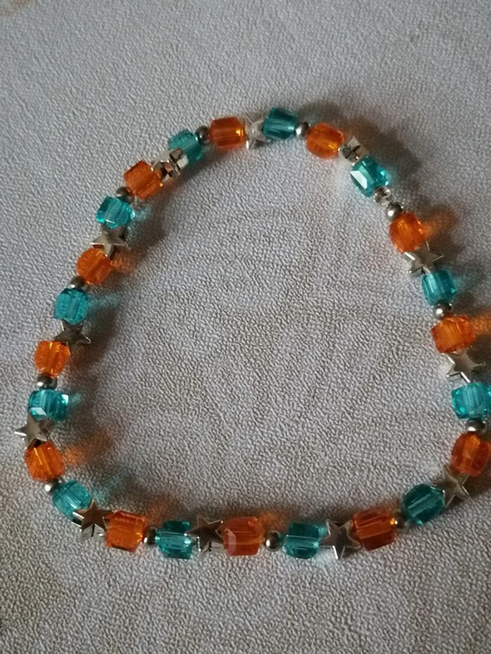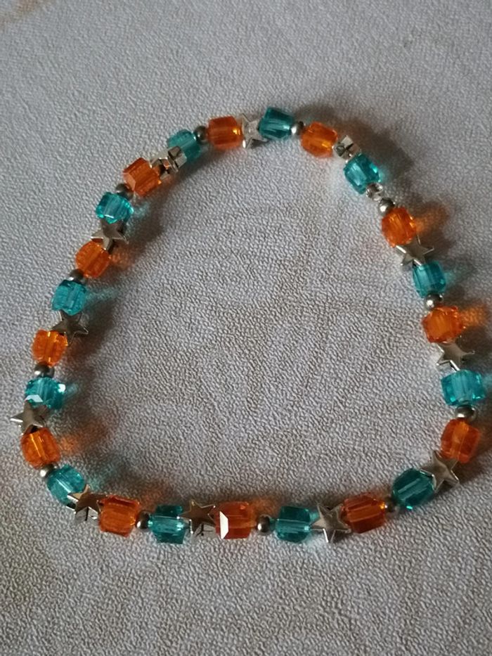 Bracelet élastique avec ses jolies petites perles carré bleu et orange en verre. Des petites étoiles argenté les séparent. 18 cm. Autre taille sur demande