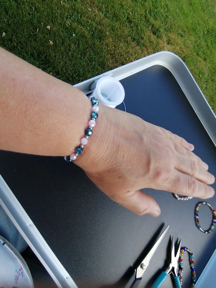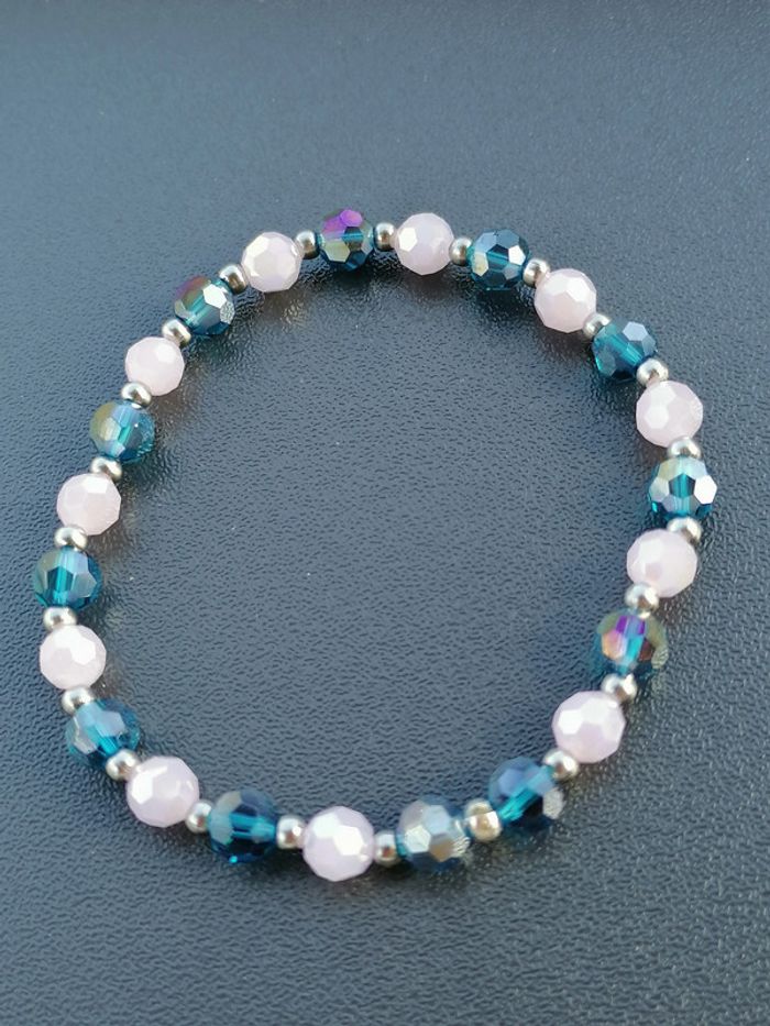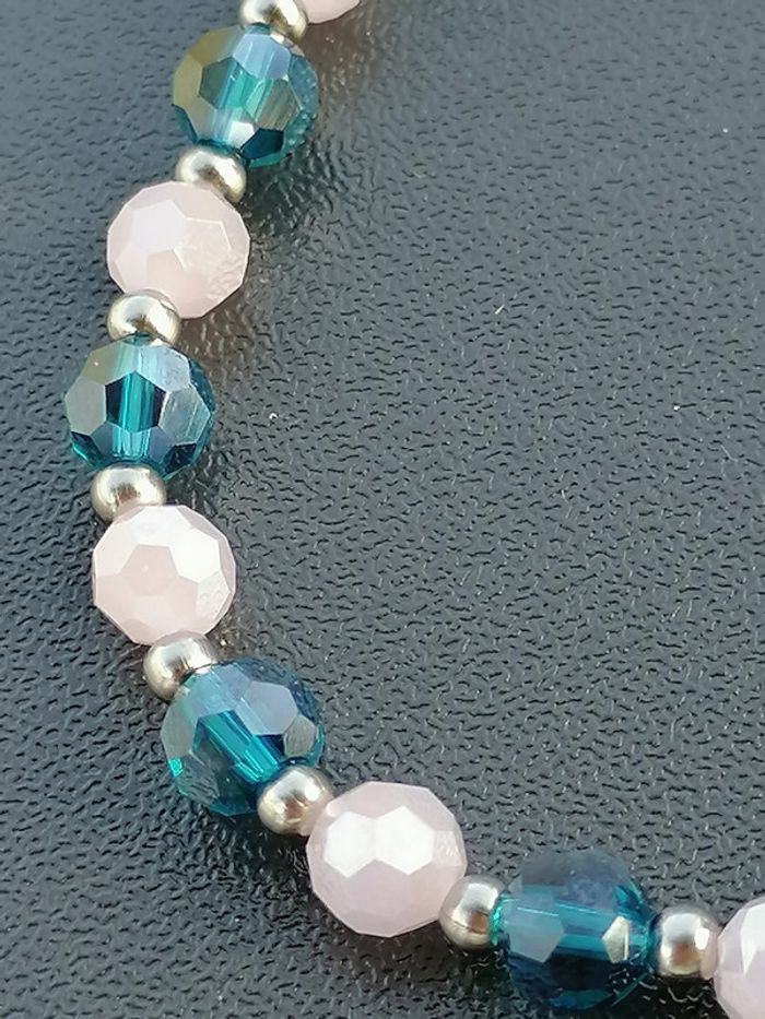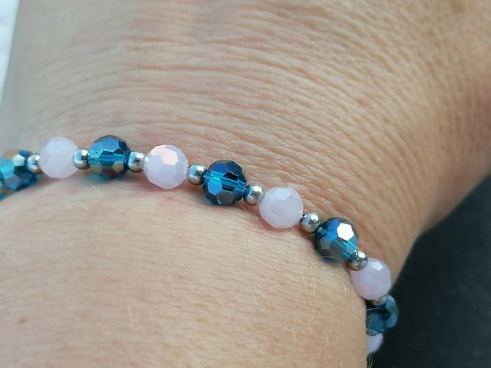 Jolie bracelet avec ses petites perles argenté et ses petites perles à facettes brillantes roses et bleue. 18 cm. Autre taille sur demande