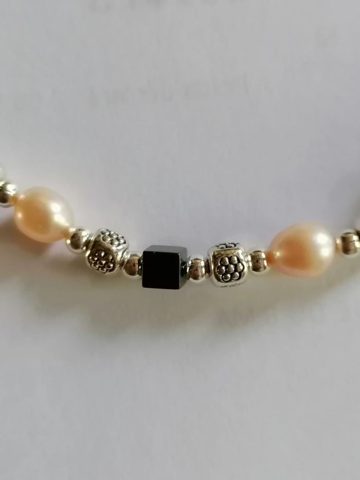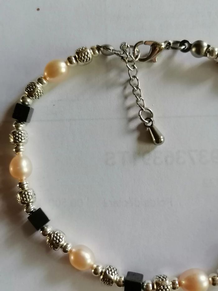 Jolie bracelet avec ses véritables perles en nacre rosée, ses petites perles carré en hématite et ses petites perles argentée. 18cm. Autre taille sur demande