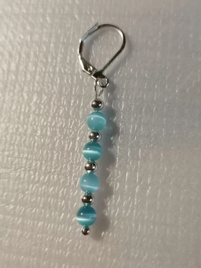 Jolie boucles d'oreilles pendentif avec ses petites perles argenté et ses petites perles œil de chat bleue.