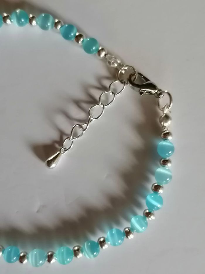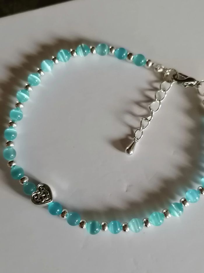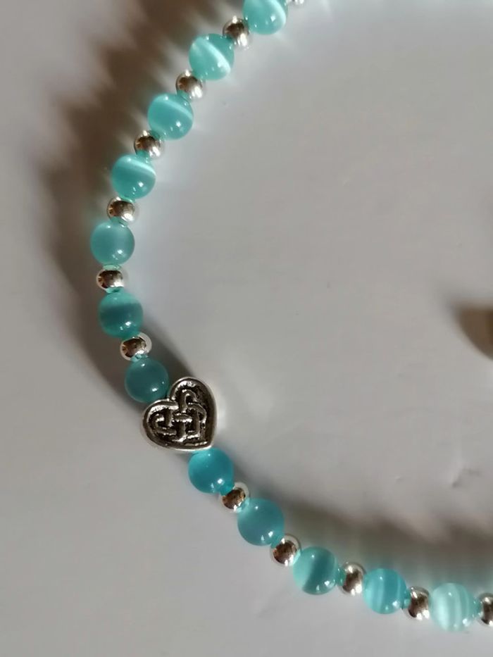 Jolie petit bracelet avec ses véritables perles argentée son petit cœur tibétain et ses petites perles bleue en oeil de chat. 18 cm. Autre taille sur demande