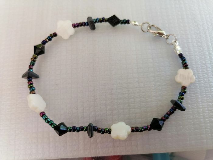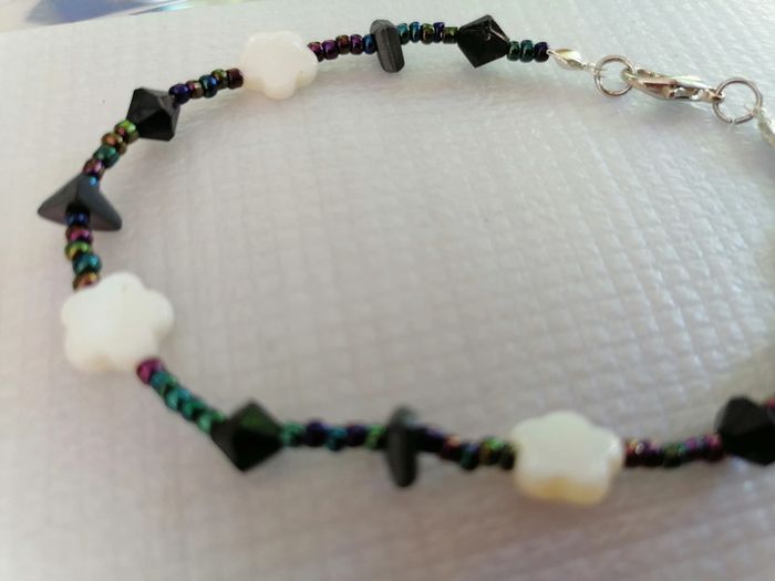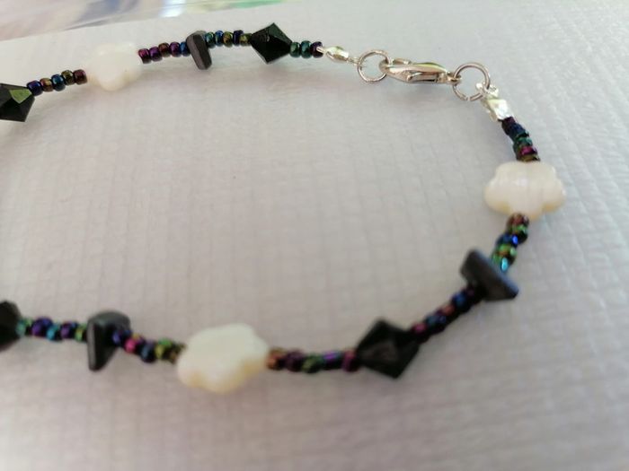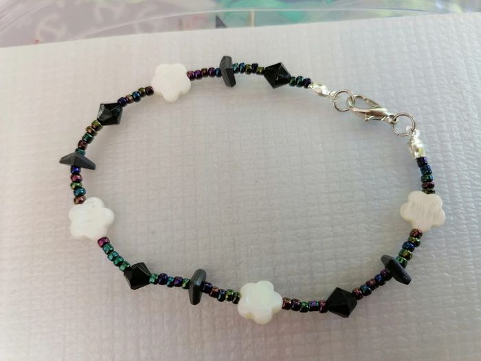 Jolie bracelet avec ses petites perles de rocailles arc en ciel et ses petites perles noires et ses jolies perles nacrée blanches en fleur 🌸