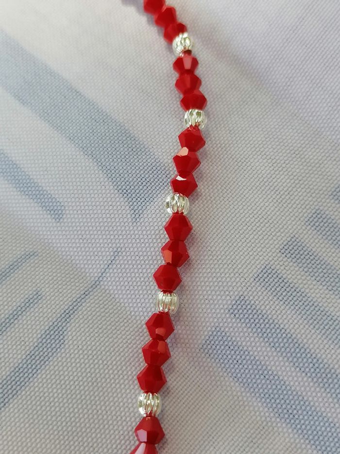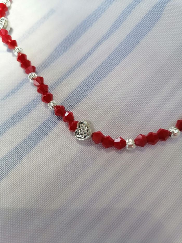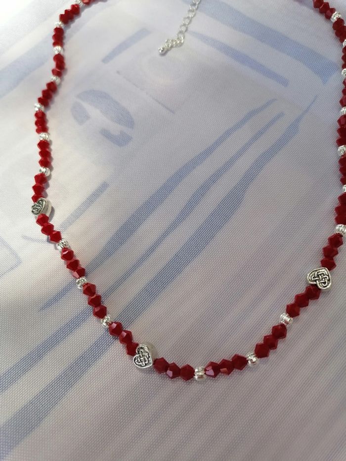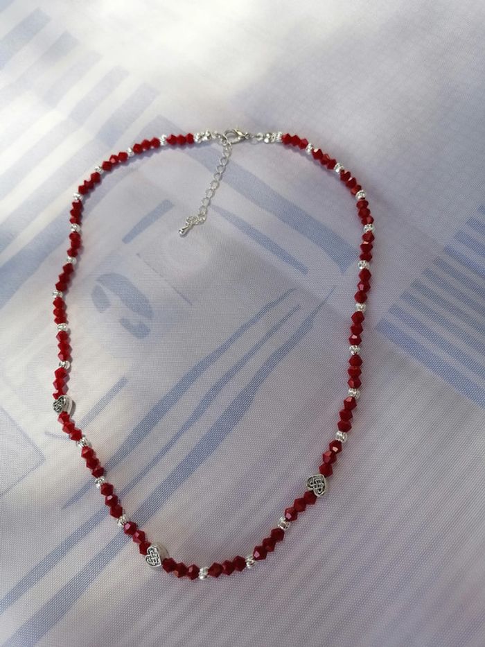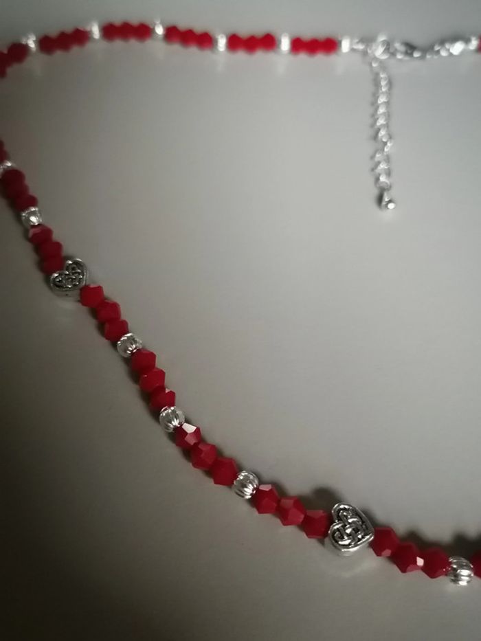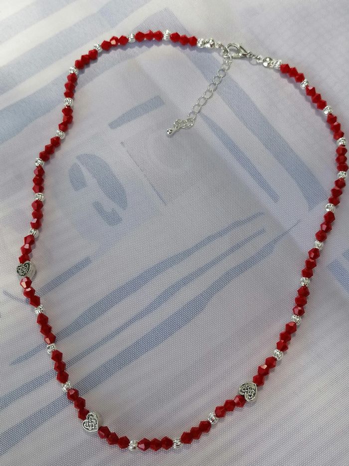 Jolie collier avec ses perles toupie rouge et ses petites perles argenté striées et ses jolis petits cœurs tibétains. 46 cm.