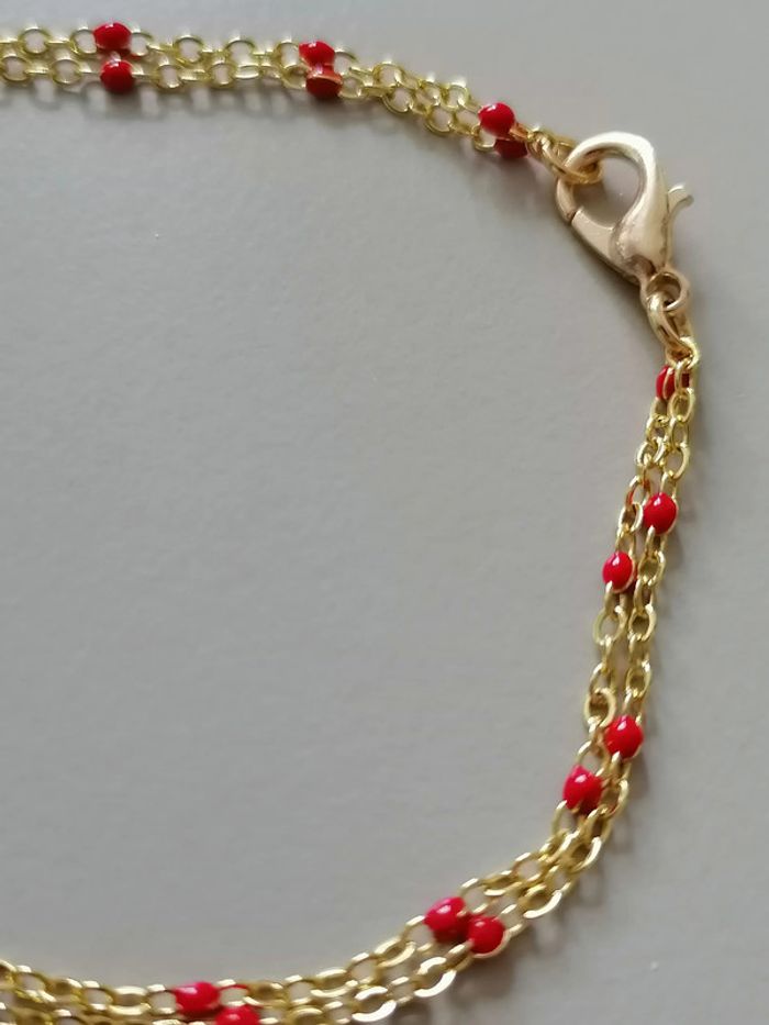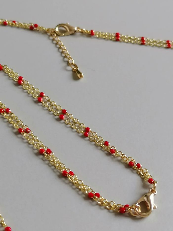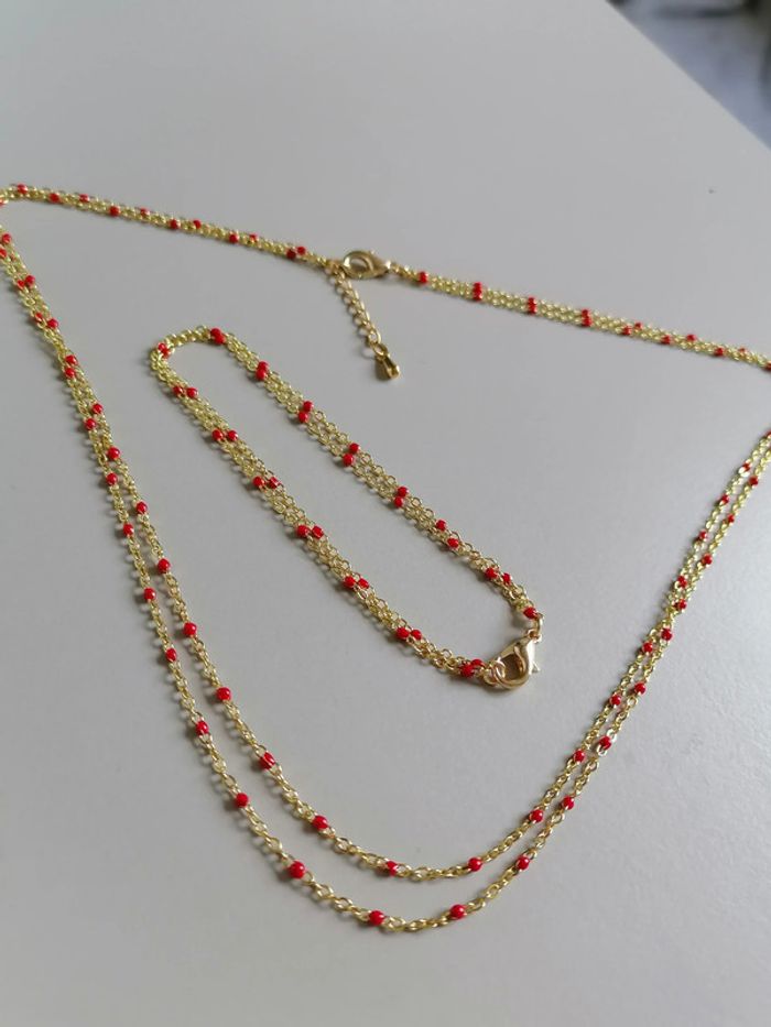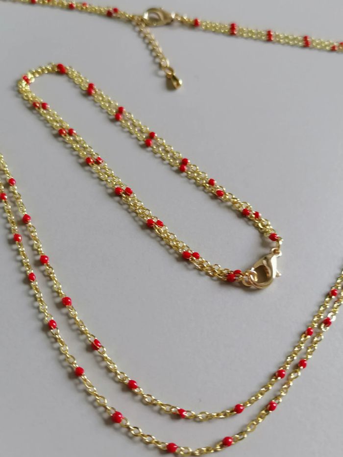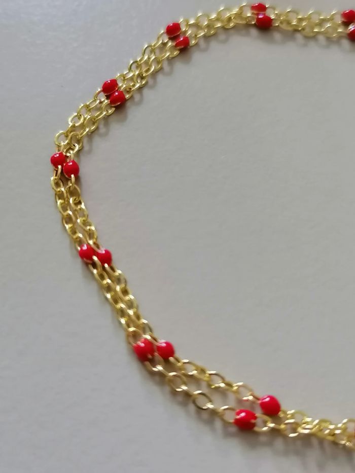 ensemble collier double et son bracelet double en acier inoxydable doré et ses petites perles rouges. Collier 46 cm. Bracelet 18 cm. Autre taille sur demande.