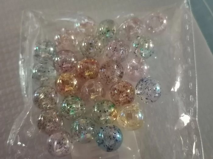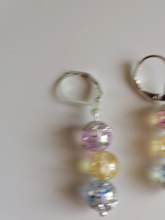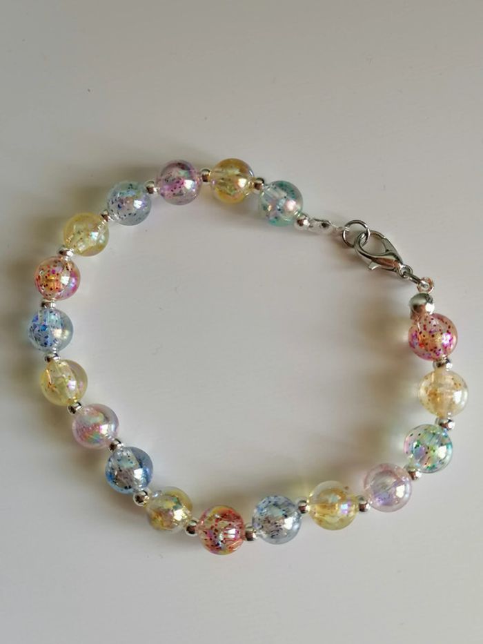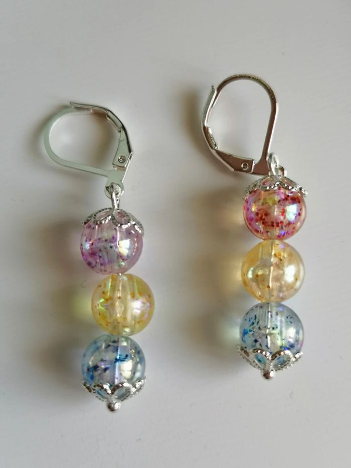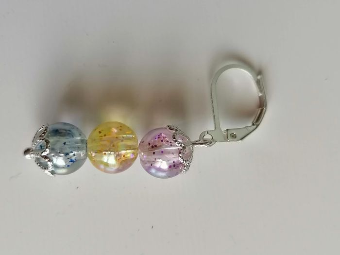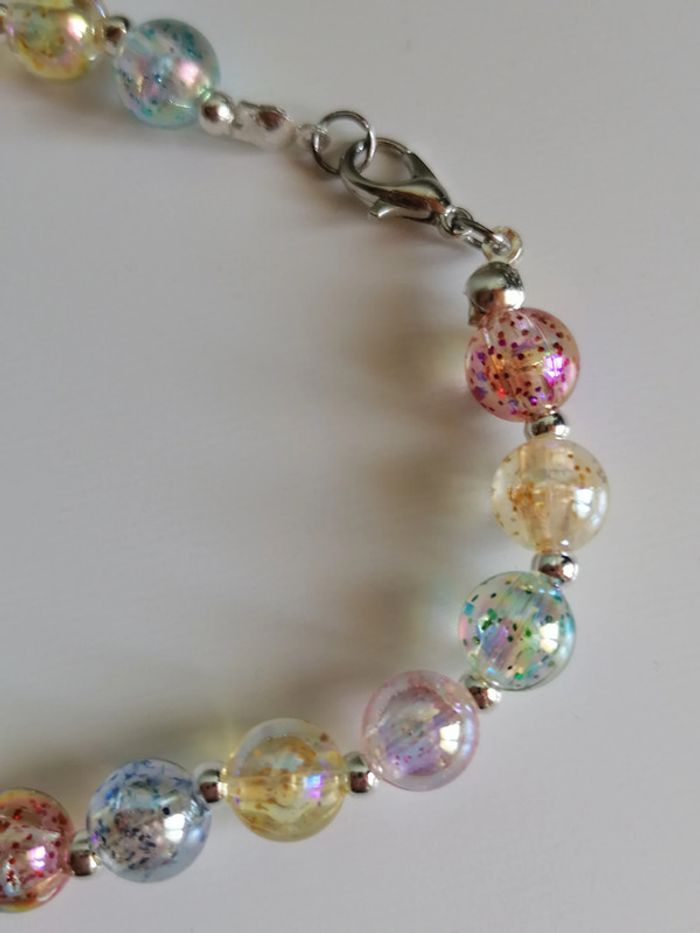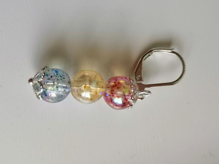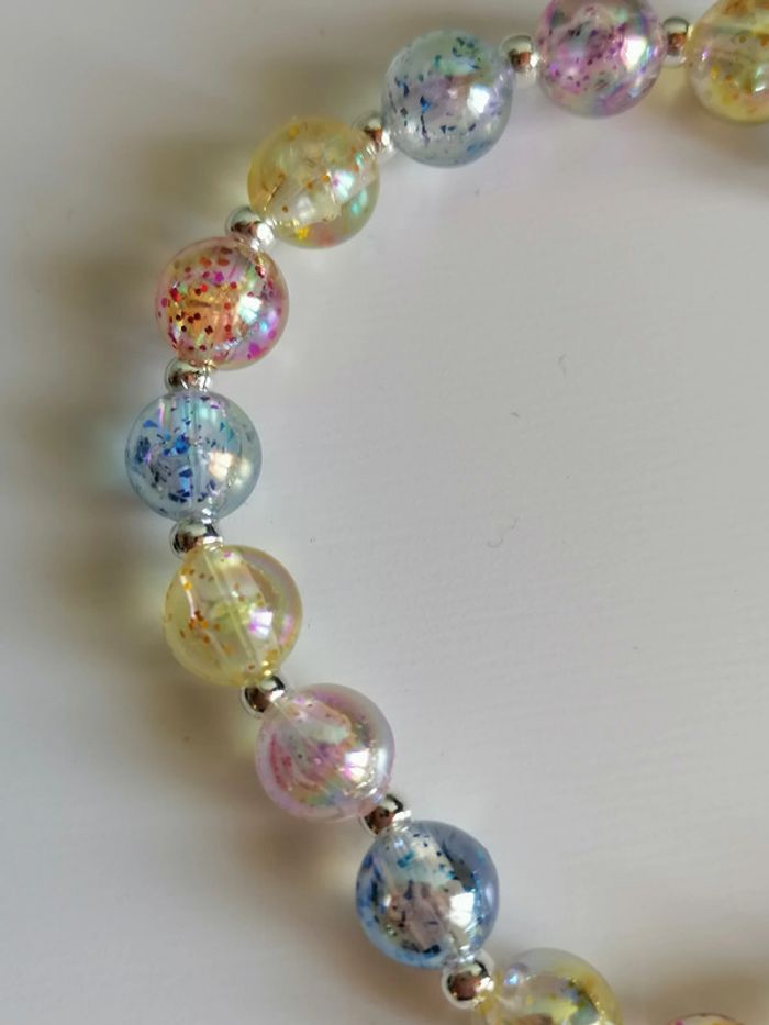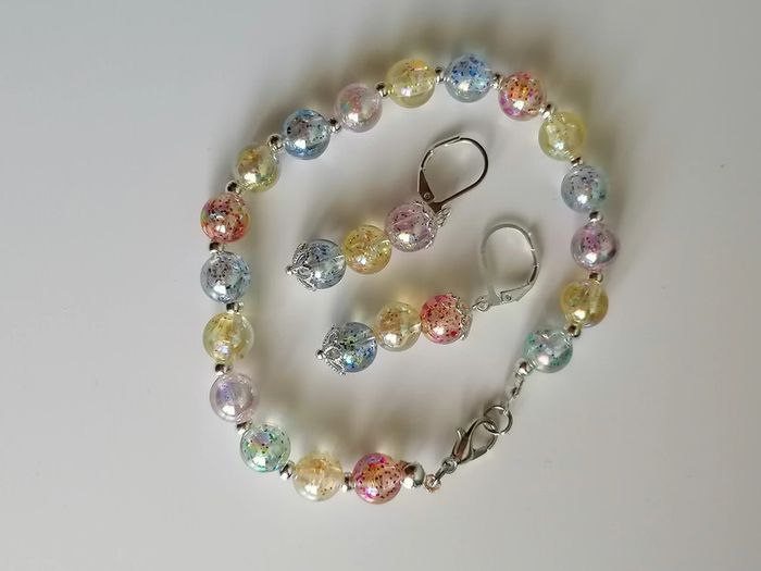 Jolie ensemble de bracelet avec ses boucles d'oreilles pendentif. Magnifiques perles pailletée en couleur. 18 cm. Autre taille sur demande
