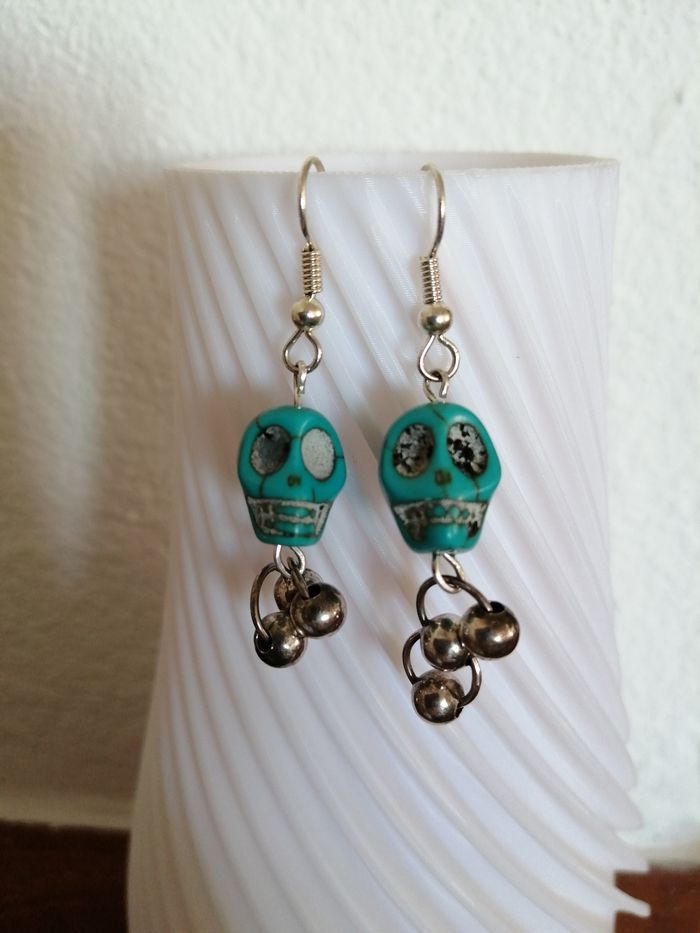 Dimension têtes de mort : 1 cm Longueur sans attaches : 3 cm / 2 cm Crochets d'oreilles sans plomb, sans cadmium, sans nickel De coloris bleu turquoise Jamais porté