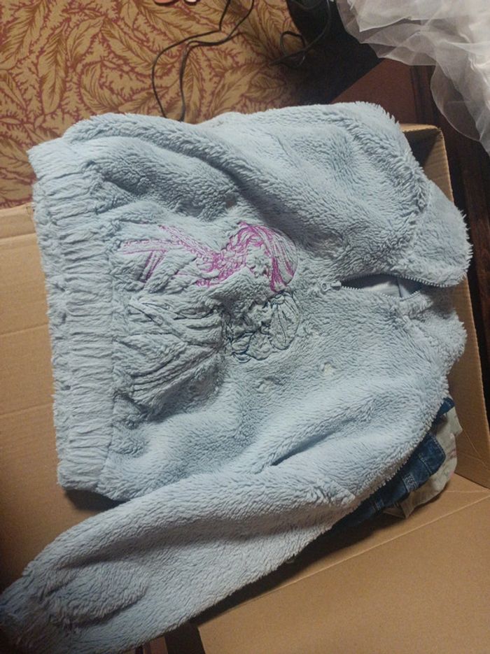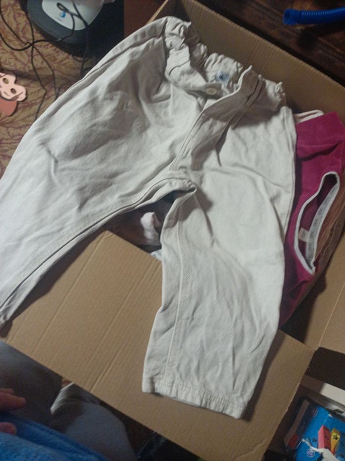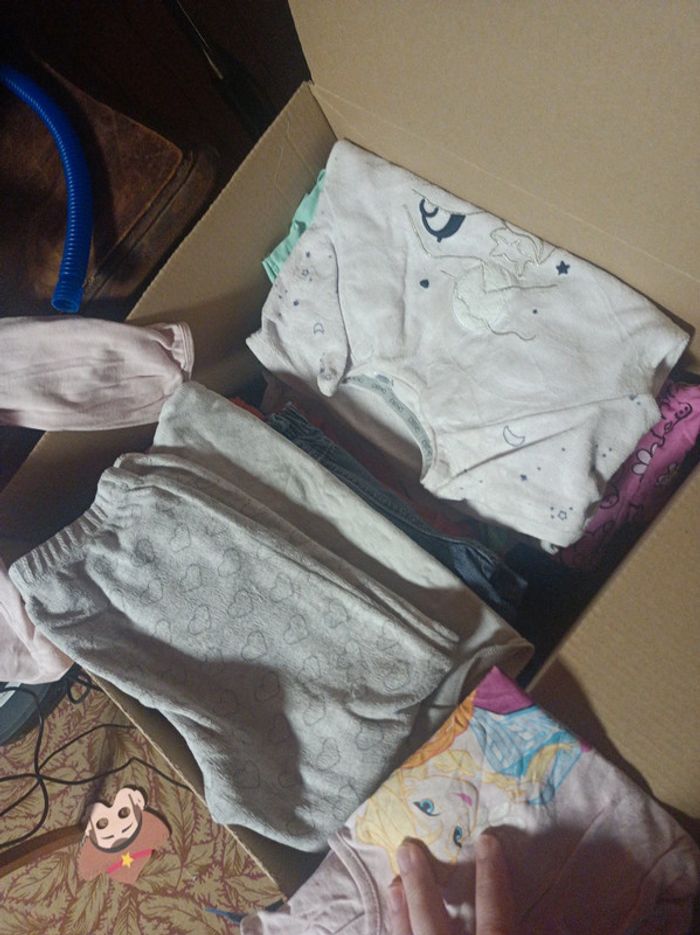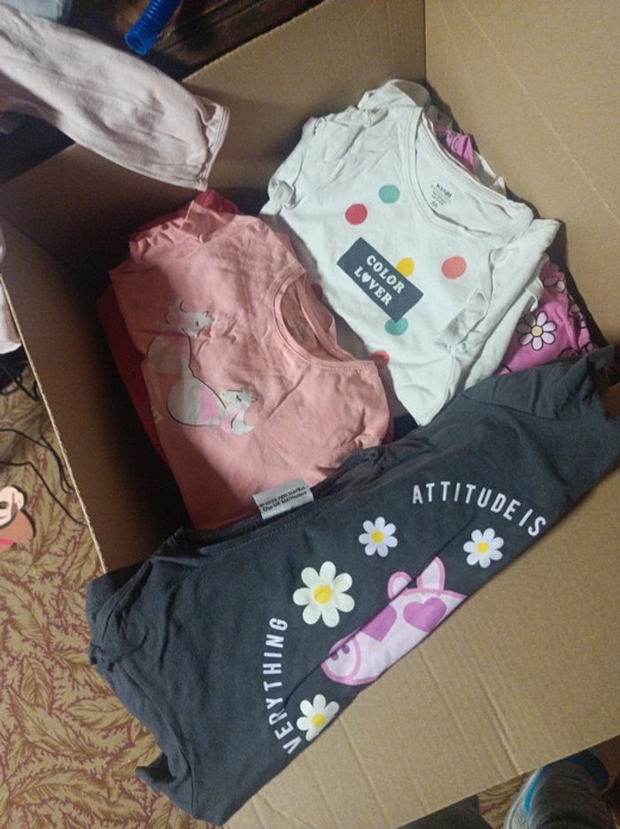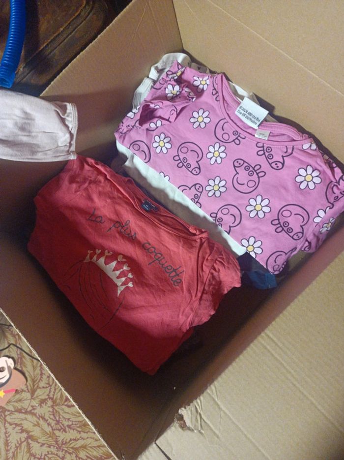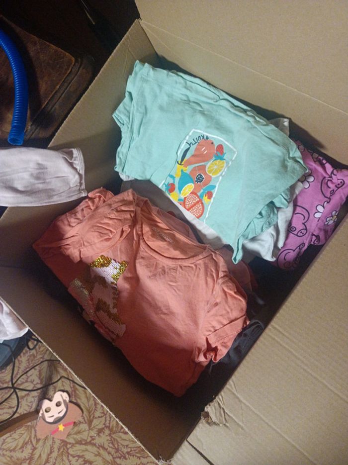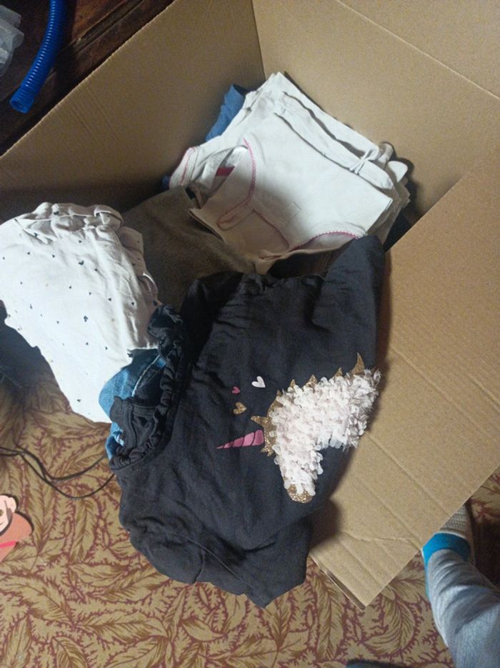 Carton rempli de vêtements pour petite fille de 2-3 ans. Taille de 36 moi a 5 ans pour certains. Ma fille les a porté entre 2 et 3 ans . Pyjama complet hiver de 4 ans Okaïdi. Robe 3 ans petit bateau. Jeans. 3 ans petit bateau. J'ajouterai au fur et mesure du trie. Actuellement plus d'une dizaine de tee shirt . Plusieurs pull dont un de la reine des neiges. En bon état.