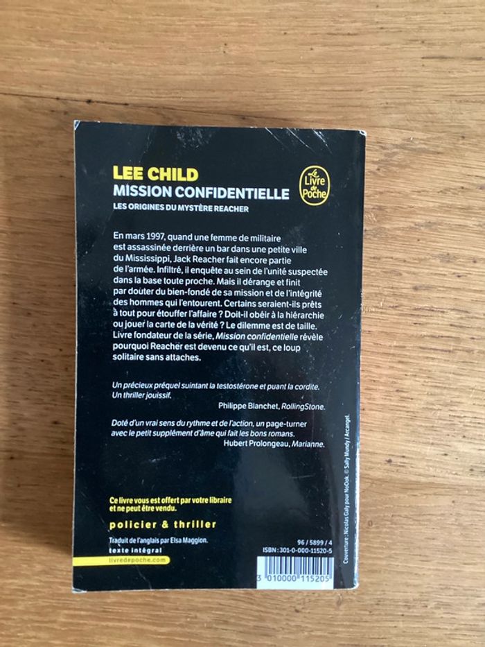 Livre « mission confidentielle les origines du mystère reacher » Lee Child Édition livre de poche Couverture un peu abîmée Prix négociable réduction en achat par lot