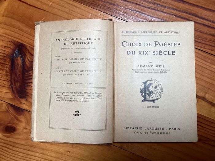 Livre « choix de poésies du xixeme siècle » Armand Weil Librairie Larousse Édition 1927 Couverture un peu abîmée Certaines pages coupées tachées ou annotées Prix négociable réduction en achat par lot