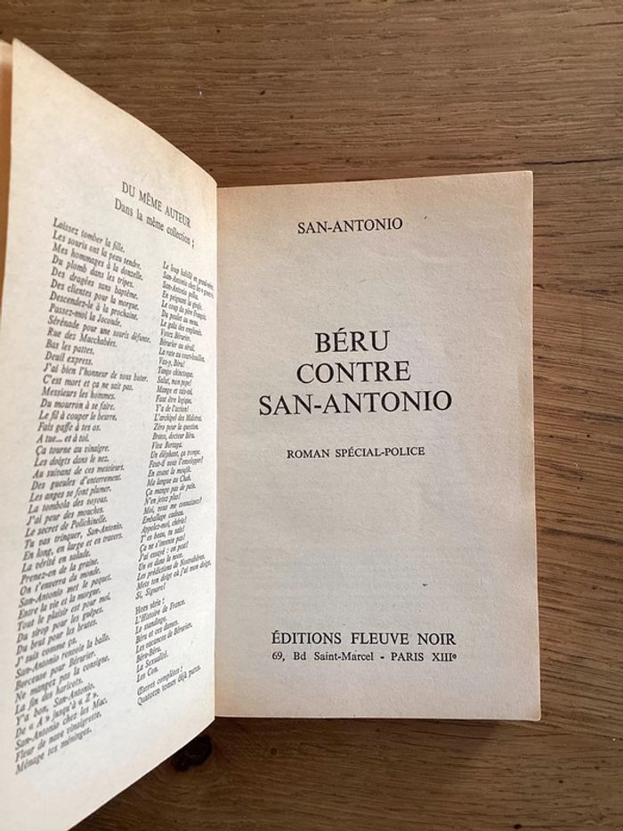Livre « beru contre san Antonio » Édition fleuve noir 1975 Couverture pliée intérieur jauni 1ere page recollée Prix négociable réduction en achat par lot