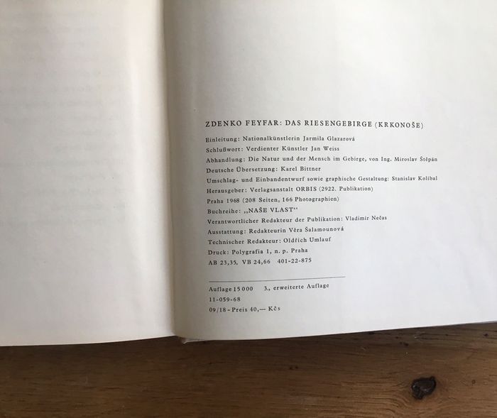 livre Riesengebirge en allemand Zdenko Feydar édition 1968 intérieur jauni prix négociable et réduction en achat par lot Bildband von Zdenko Feyfar, 208 Seiten mit 166 meisterhaften Fotos, ORBIS Praha 1968, Z.Feyfar: Einer der bedeutendsten Kunstschaffenden auf dem Gebiete der Fotografie in der CSSR, gebürtig in Jilemnice, bekennt in diesem Buche seine Liebe zu den heimatlichen Bergen. Weißer Leinen-Einband mit Schutzumschlag, 3. erweiterte Auflage