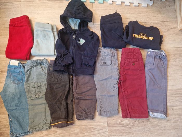 Lot de 12 vêtements 12 mois pour bébé garçon en super état ▶️ 1 pantalon gris Obaïbi avec doublure douce et légère, système élastique intérieur pour régler la taille, comme neuf (peu porté) ▶️ 1 pantalon en toile gris Obaibi avec taille élastique et petits cordons de serrage, en très bon état ▶️ 1 jeans Kaki clair Obaïbi avec élastique intérieur pour régler la taille, comme neuf ▶️ 1 pantalon en toile bordeaux, Grain de blé, en très bon état, avec élastique intérieur pour régler la taille ▶️ 1 pantalon en toile bleu Obaïbi avec élastique intérieur pour régler la taille, en très bon état ▶️ 1 pantalon en toile gris Sergent Major, avec élastique intérieur pour régler la taille, comme neuf ▶️ 1 jeans doublé P'tit Bisou, avec pressions à l'entrejambe pour faciliter le change, en très bon état ▶️ 1 pantalon de jogging rouge Kiabi, comme neuf, très confortable et doux dedans ▶️ 1 ensemble sweat + pantalon de jogging bleu marine avec inscription jaune Kiabi, en très bon état ▶️ 1 ensemble sweat à capuche + pantalon jogging Kiabi, marine et vert d'eau, comme neuf Envoi rapide et soigné Réduction sur les lots