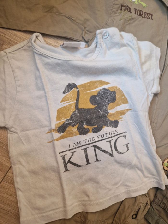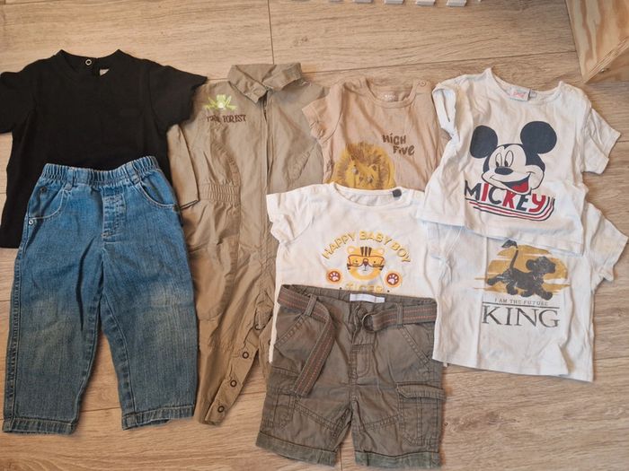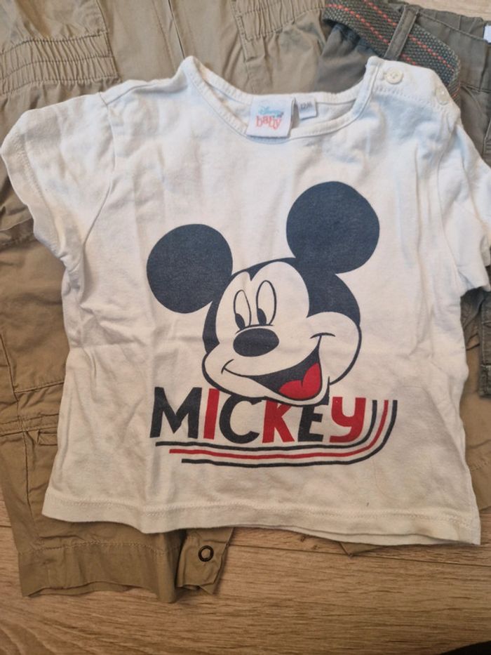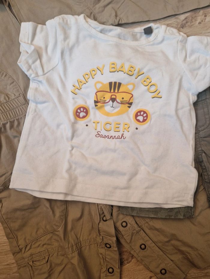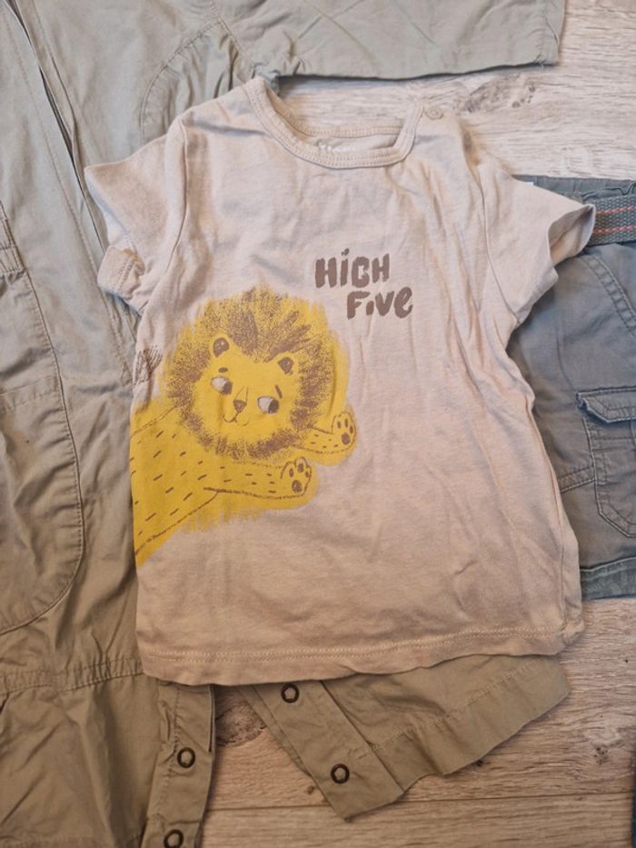 Lot de 8 vêtements été pour bébé garçon, taille 12 mois (74 cm). ▶️ 2 t-shirts Disney en très bon état ▶️ 1 t-shirt blanc avec tigre, neuf sans étiquette, Boîte à malice ▶️ 1 t-shirt beige motif lion, Kiabi, comme neuf ▶️ 1 adorable short Kaki Gemo avec ceinture amovible, taille élastique réglable à l'intérieur, neuf sans étiquette ▶️ 1 jeans taille élastique Nano & Nanette, neuf sans étiquette ▶️ 1 t-shirt noir Pik Ouic neuf sans étiquette ▶️ 1 jolie combinaison en toile légère avec fermeture et boutons pressions (facilite le change), neuve sans étiquette Envoi rapide et soigné Réduction sur les lots