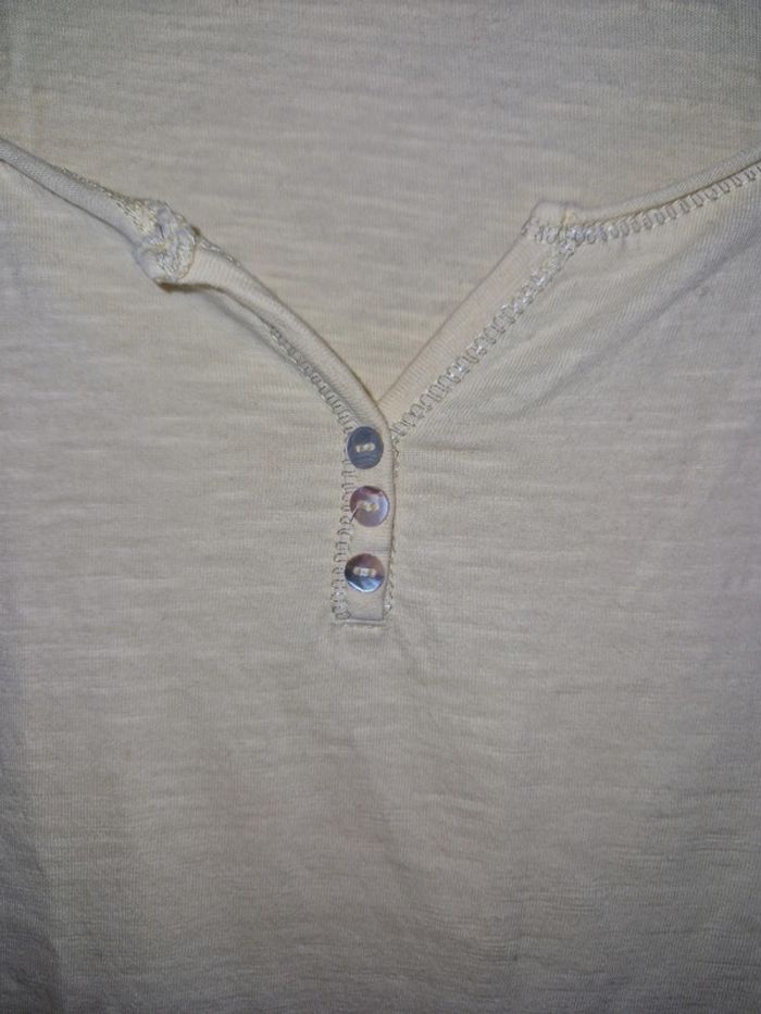 Joli et féminin t-shirt jaune pâle. Finitions élégantes : 3 petits boutons nacrés et coutures légèrement brillantes. Fin et léger, idéal printemps/été. Matière coton et élasthane (extensible) Comme neuf (peu porté) Taille 42/44 Étiquette intérieure coupée car gênait Envoi rapide et soigné Réduction sur les lots