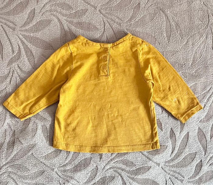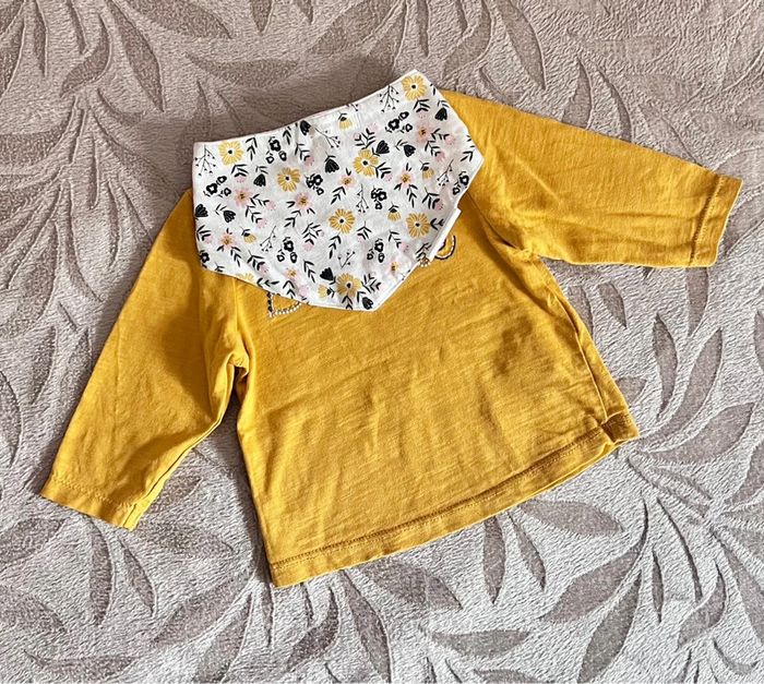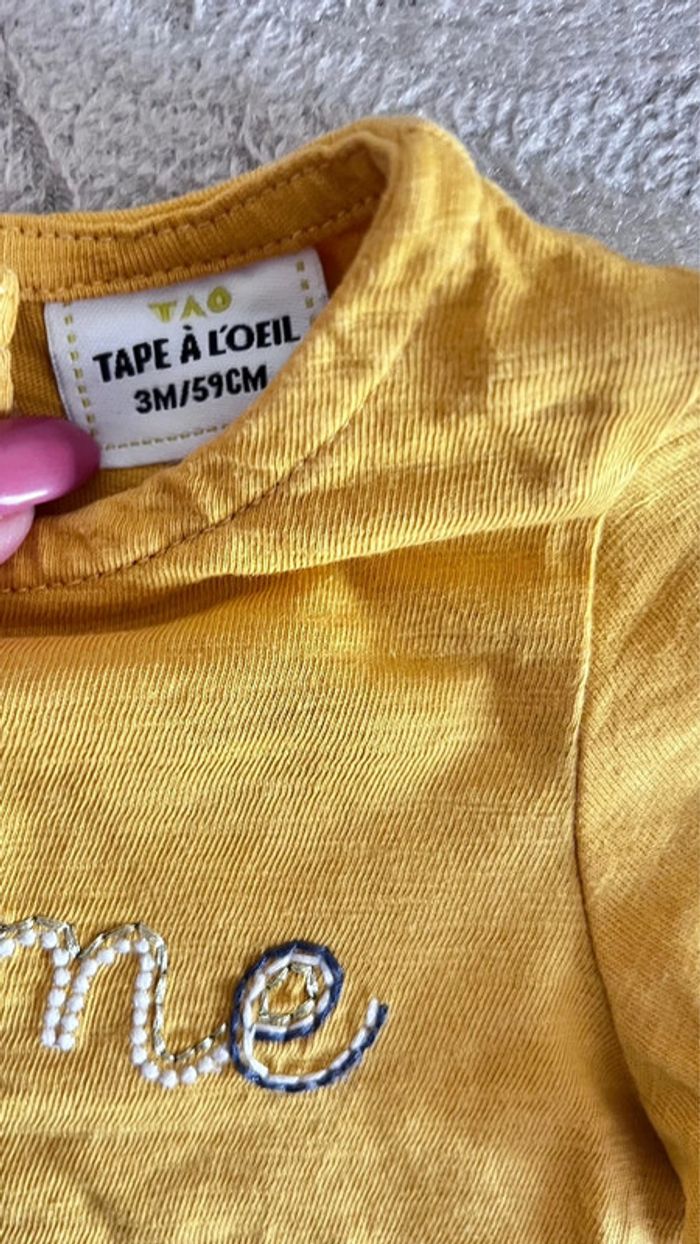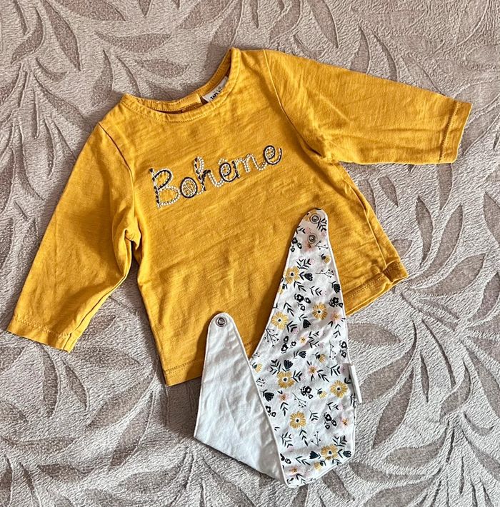 T-shirt à manches longues Tape à l’œil 3 mois Coloris moutarde Écrit Bohême devant en broderie Boutons pression au dos 100 % coton Petites tâches blanches au bras (voir photos) J’offre un foulard assorti qui est un peu taché qui s’attache avec des boutons pression Maison non fumeur et sans animaux 📩Je réponds rapidement aux messages 📦Envoi rapide et soigné