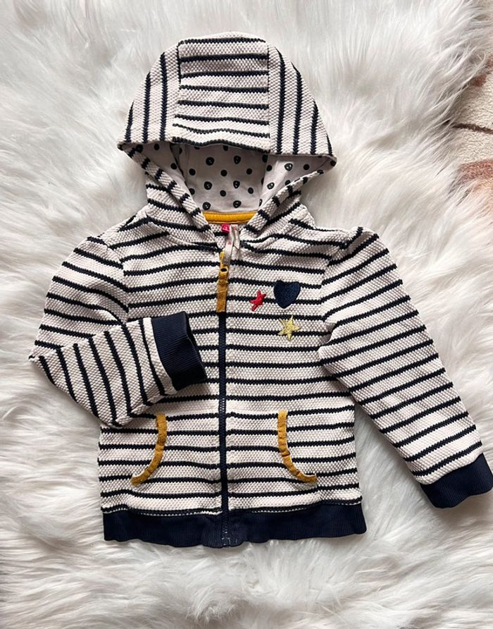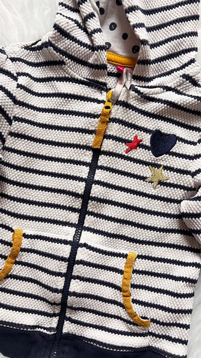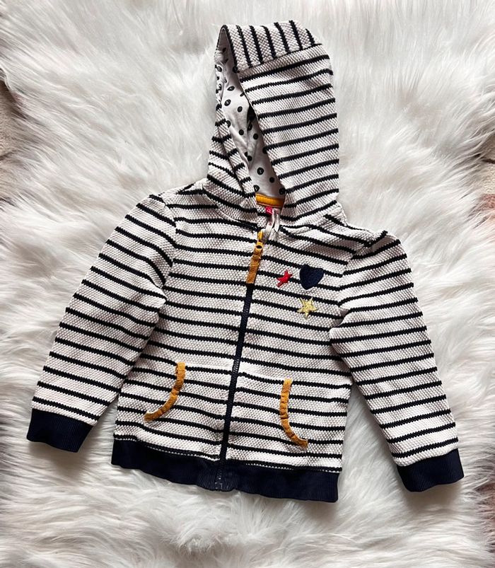Veste gilet à capuche Orchestra Marinière idéale pour le printemps 18 mois 81 cm Coloris bleu marine, blanc et motifs colorés Deux poches 95 % coton 5 % élasthanne Fermeture éclair Petit défaut de fabrication avant dernière photo un point marron 📩Je réponds rapidement aux messages 📦Envoi rapide et soigné