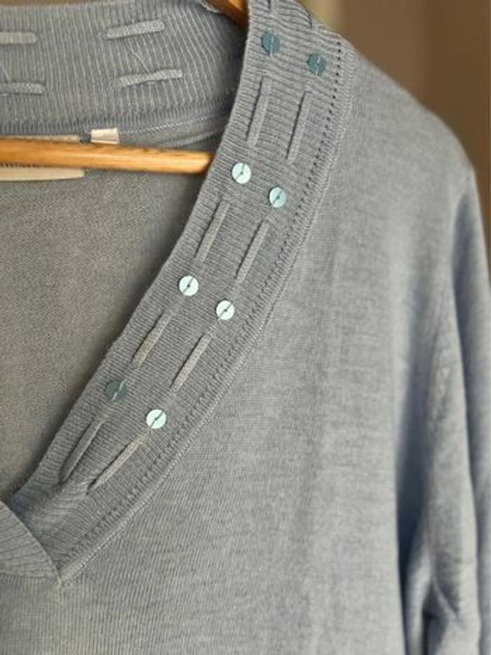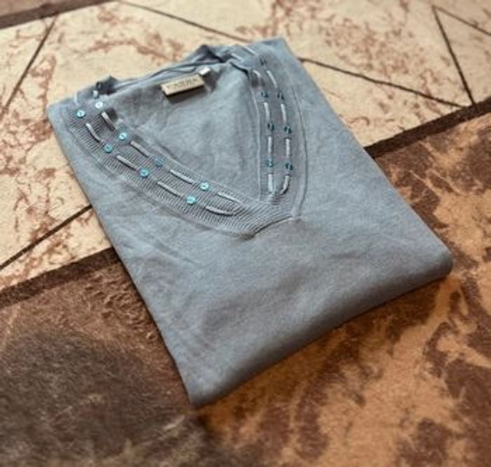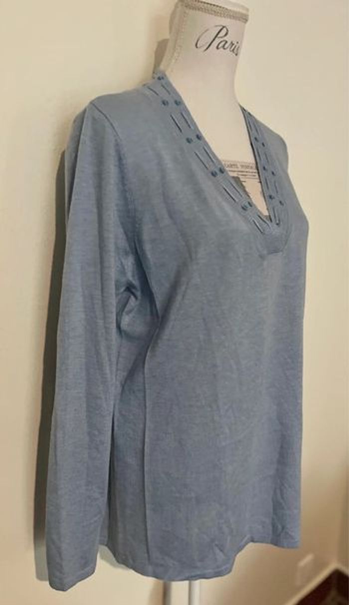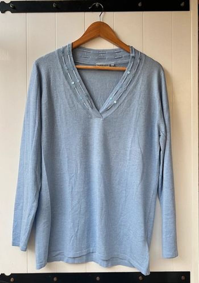 Joli pull fin Canda collection C&A Peu porté Indiqué taille L mais plus une taille 44 54 cm de largeur 73 cm de longueur Coloris bleu Matière douce Col V 55 % polyester 20 % acrylique 20 % nylon 5 % laine Maison non fumeur et sans animaux 📩 Je réponds rapidement aux messages 📦 Envoi rapide et soigné