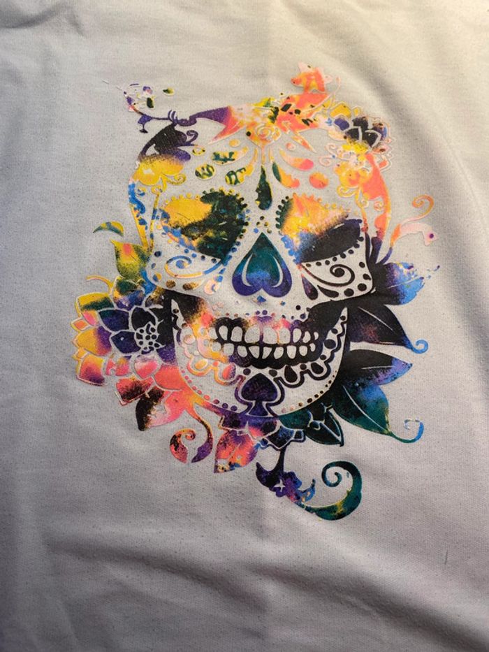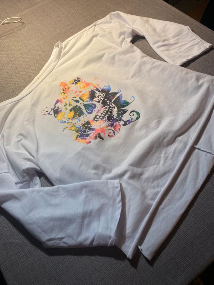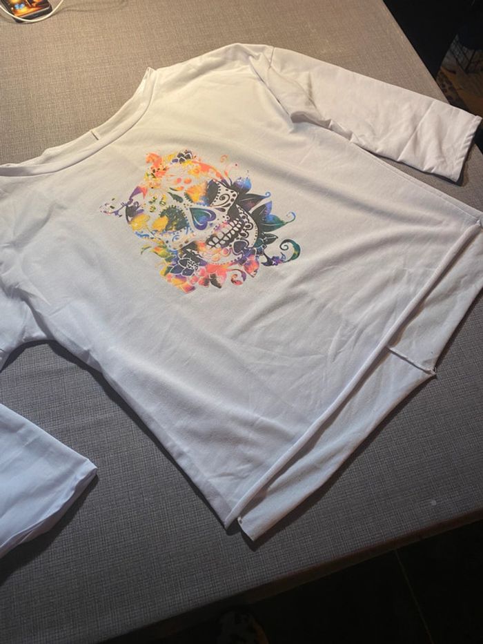 Haut tête de mort coloré Style loose Étiquette coupée idéal 42/44 Manches 3/4 Tb état général, qlqes bouloches (dernière photo) #hautskinny #calaveras