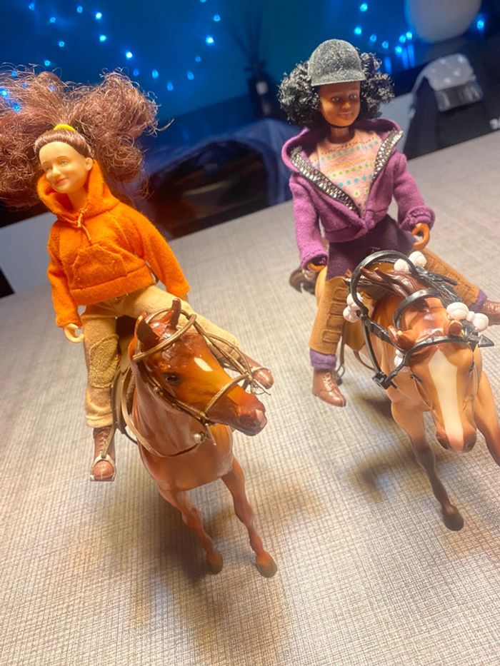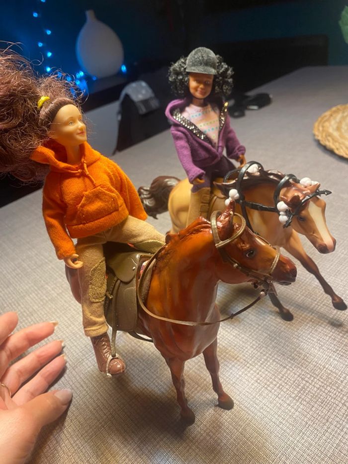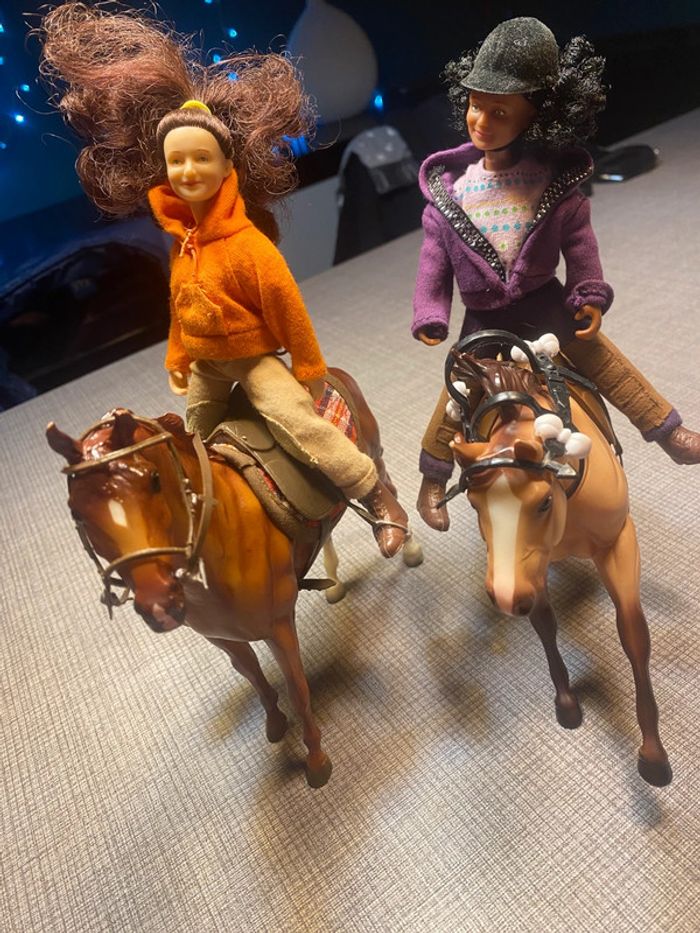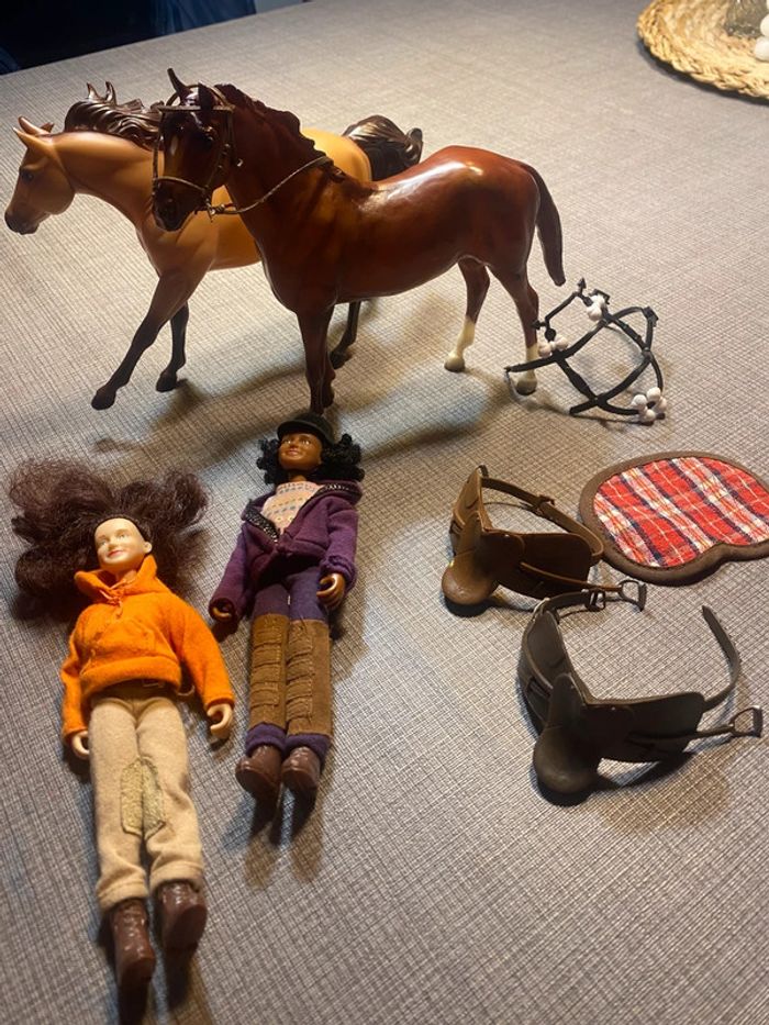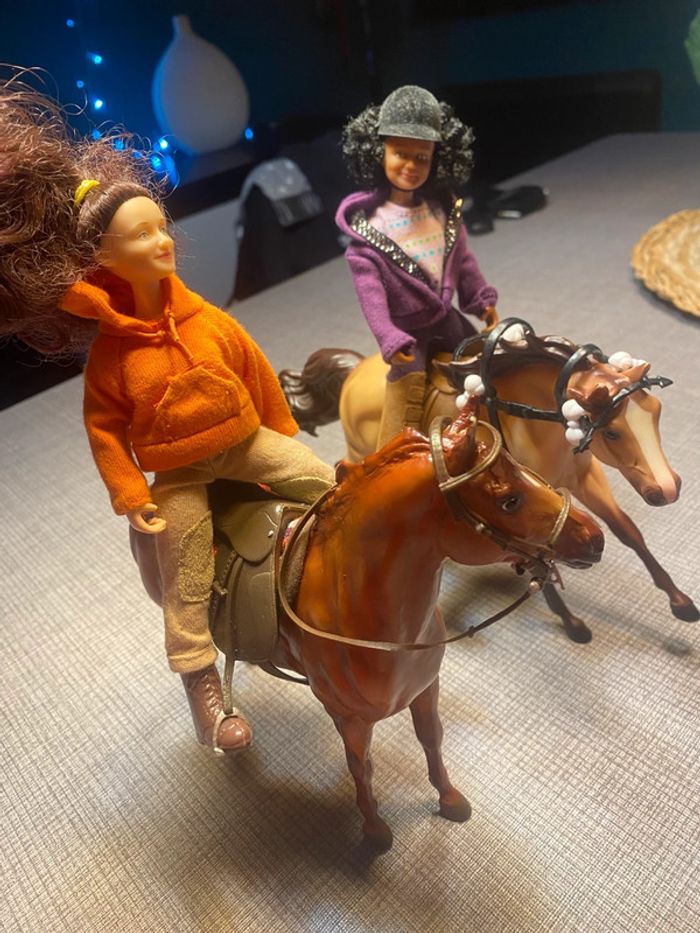 2 poupées et leurs chevaux Avec les accessoires des photos(…) Tb état, une attache cassée (dernière photo ) #chevaux #cavaliereschleich #poupeecavaliere