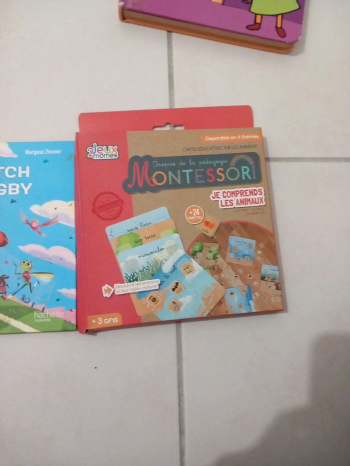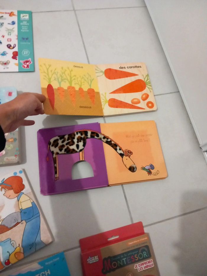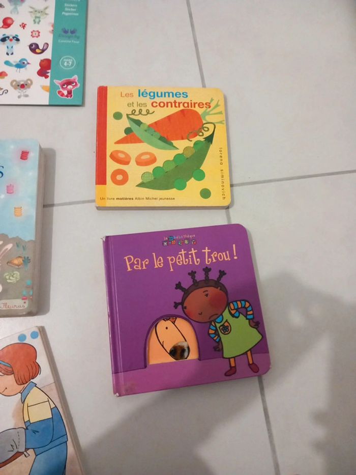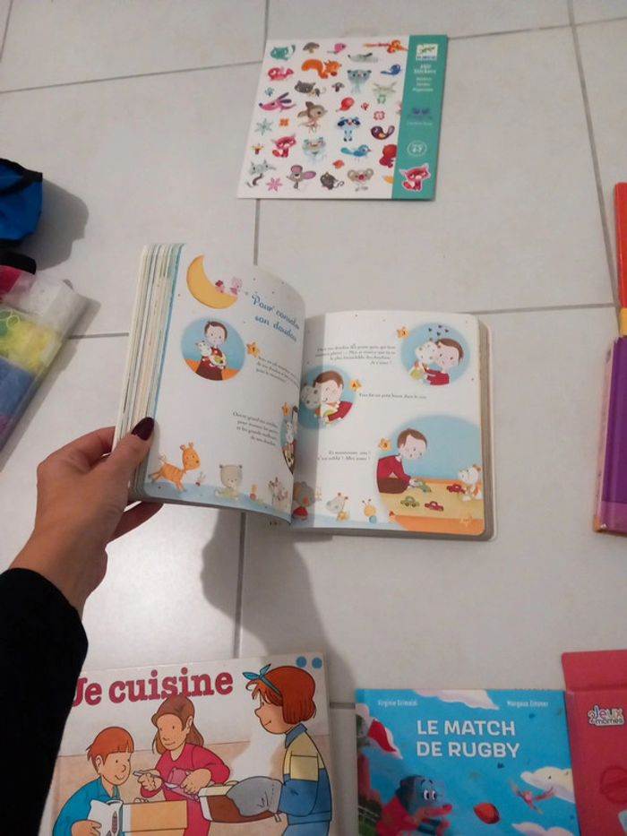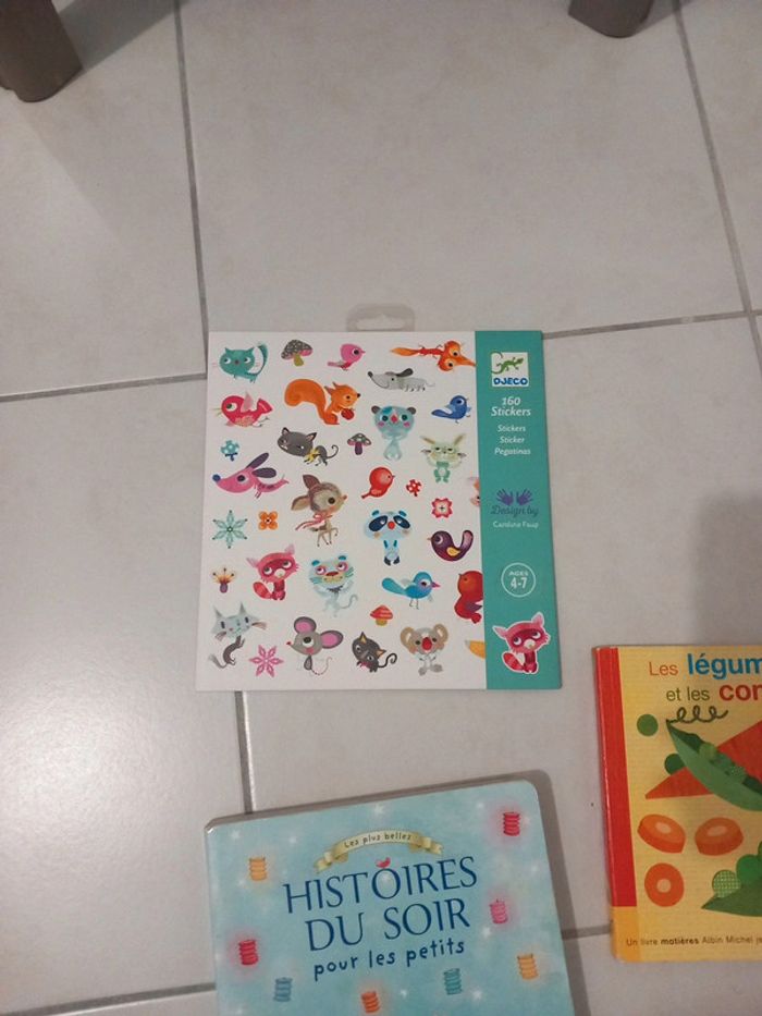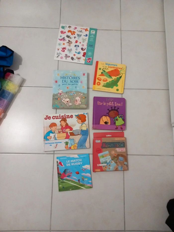 stickers pas complet mais en reste pas mal histoires du soir pour les petits : 260 pages livre les légumes et les contraires livre par le petit trou avec toucher livre je cuisine les bonnes recettes livre le match de rugby 2 jeux montessori je comprends les animaux