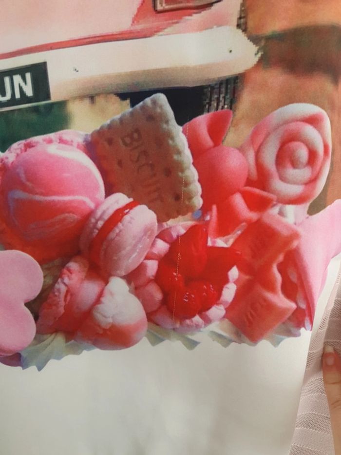 Robe à motif pour enfant en 2 couches. La première avec de la dentelles roses derrière et une robe simple blanche en dessous. Petit accro sur le bas de la robe (voir photo)