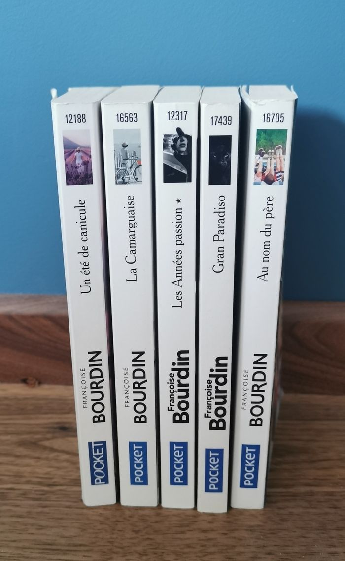 4 titres de Françoise Bourdin Edition Pocket Au nom du père (vendu) Les années passion Gran Paradiso La Camarguaise Un été de canicule (offert, la couverture est marquée et les pages sont jaunies ) Peuvent être remis en main propre sur Paris, La Défense, Bibliothèque François Mitterrand, Gare de Lyon, Etampes, etc...