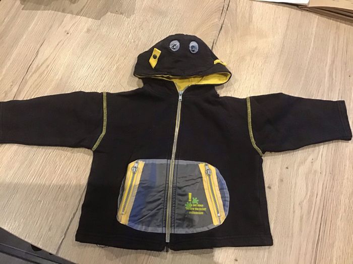 texture sweat poche avant en plastique transparent gilet marron et jaune 2 ans #poussindu67_2ans