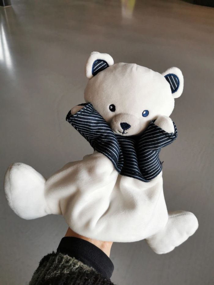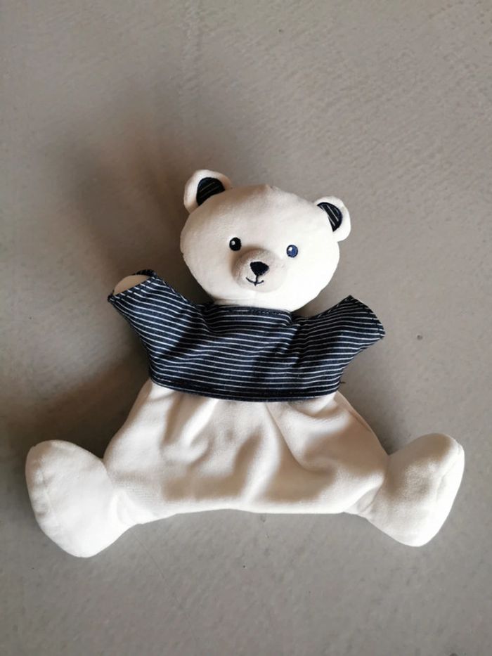 En parfait état Doudou marionnette Ours blanc t-shirt rayé bleu marine SIMBA KIABI