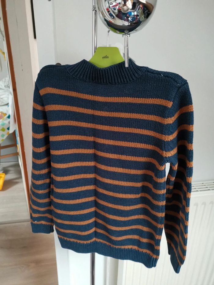 Pull Du Pareil au même, garçon, 6 ans, 116 cm Pull en très bon état, légère décoloration due aux lavages Marine et rayures marrons 3 boutons sur le col