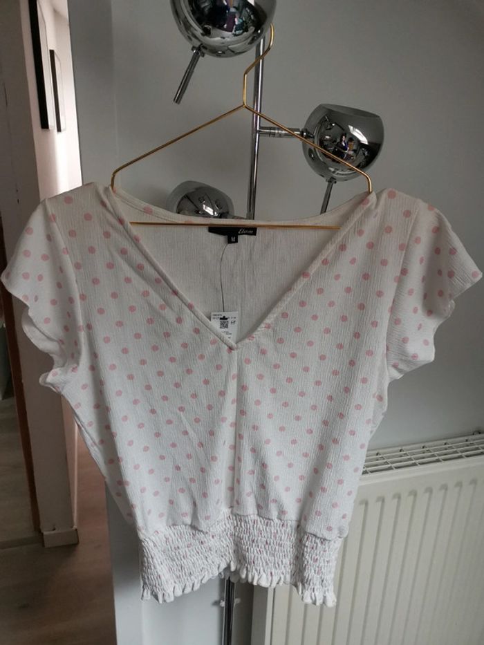 T-shirt manches courtes Blanc avec pois roses TM, taille élastiquée Neuf avec étiquette