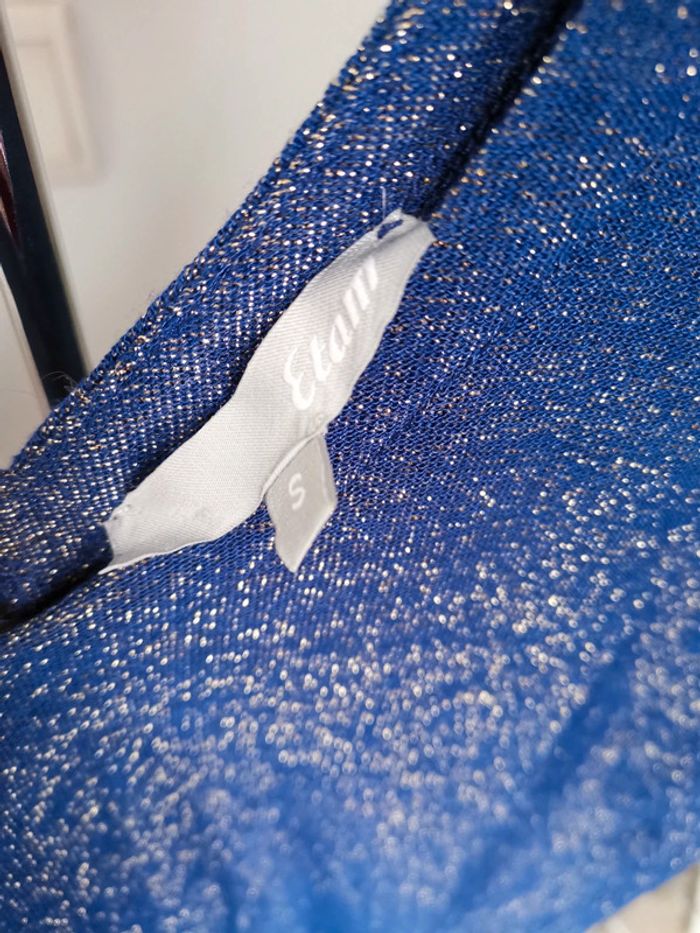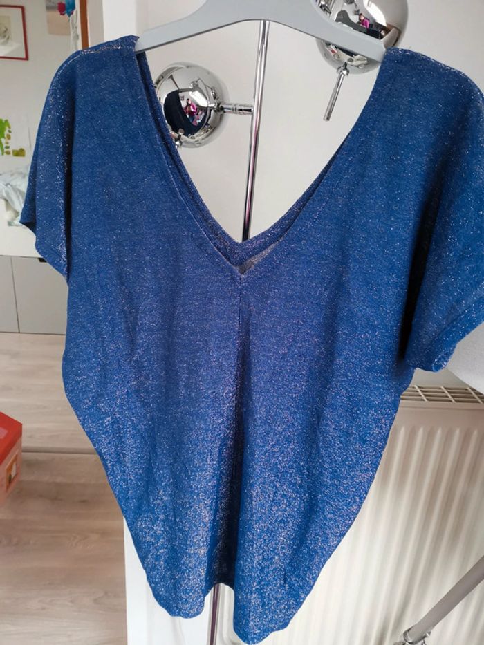 T-shirt Etam col V manches courtes très peu porté Bleu avec fibres dorées Taille bien Décolleté poitrine et dos est le même