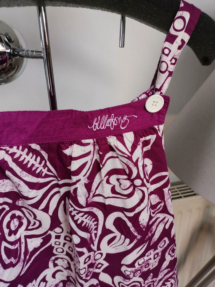 Joli débardeur acheté il y a longtemps, mais très peu porté Couleur violet Étiquette intérieure a jauni avec le temps Jolis motifs blancs sur fond violet