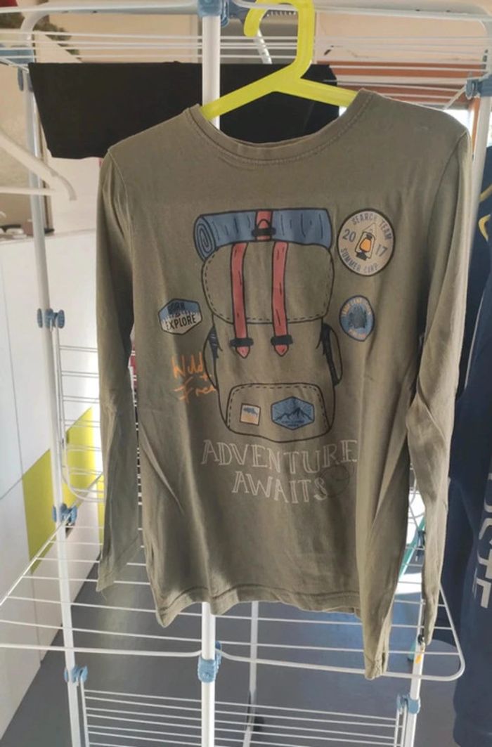 T-shirt à manches longues kaki avec un dessin de sac à dos pour les petits aventuriers. Très bon état. Taille 134 cm = 8 / 9 ans. Acheté à Primark #vulariGarcons8ans #vulariGarcons9ans #vulariPrimark