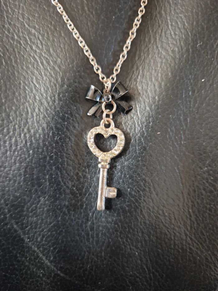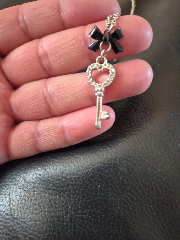 ➡️mes autres annonces de bijoux et accessoires👉 #cg89bijoux 😁réductions activées des 2 articles ! un collier ras de cou avec chaine argenté et un pendentif en forme de clef avec strass et un noeud noir. très bon état #collier #rasdecou #chaine #bijoux #strass #clef #pendentif #noeud