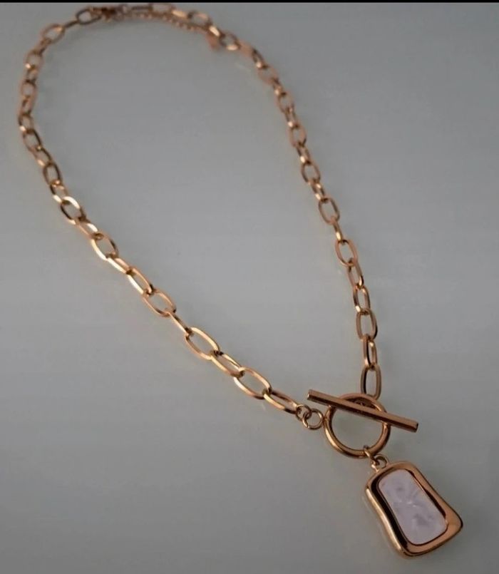 Joli collier en acier inoxydable doré avec bremoque forme géométrique nacré blanc Ajustable J'offre un pochon Envoi rapide et soigné