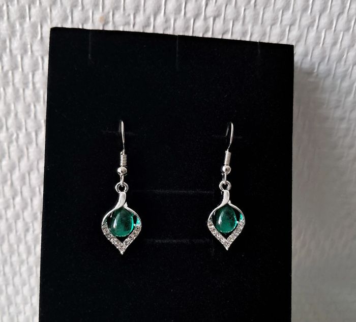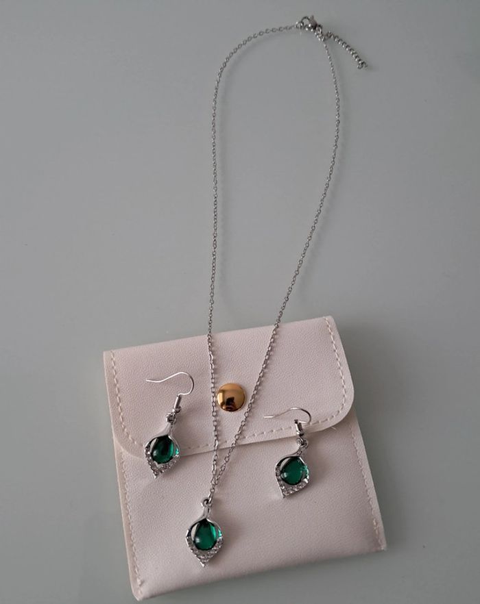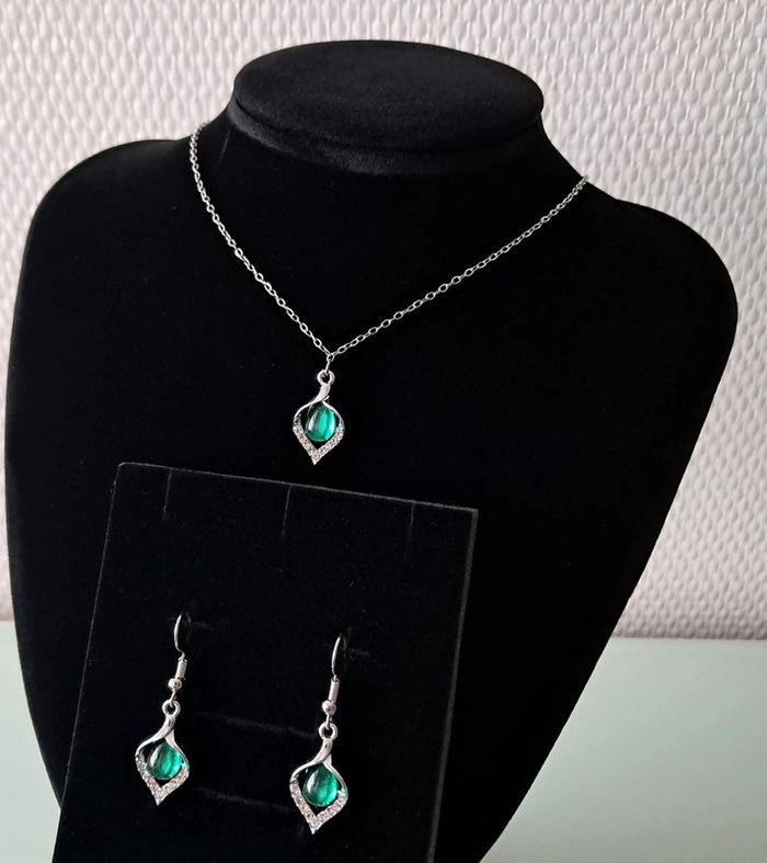 Collier er boucles d'oreilles argenté avec pendentif formes larmes verte En acier inoxydable Collier ajustable 44cm+4 Neuf Offre un pochon Envoi rapide et soigné #pendentiflarme
