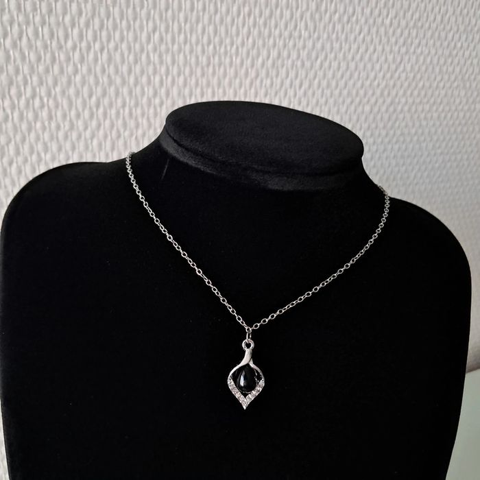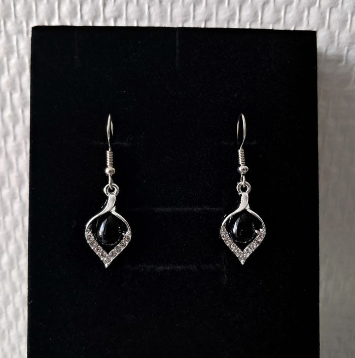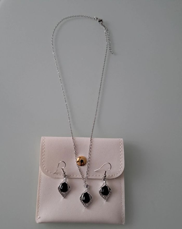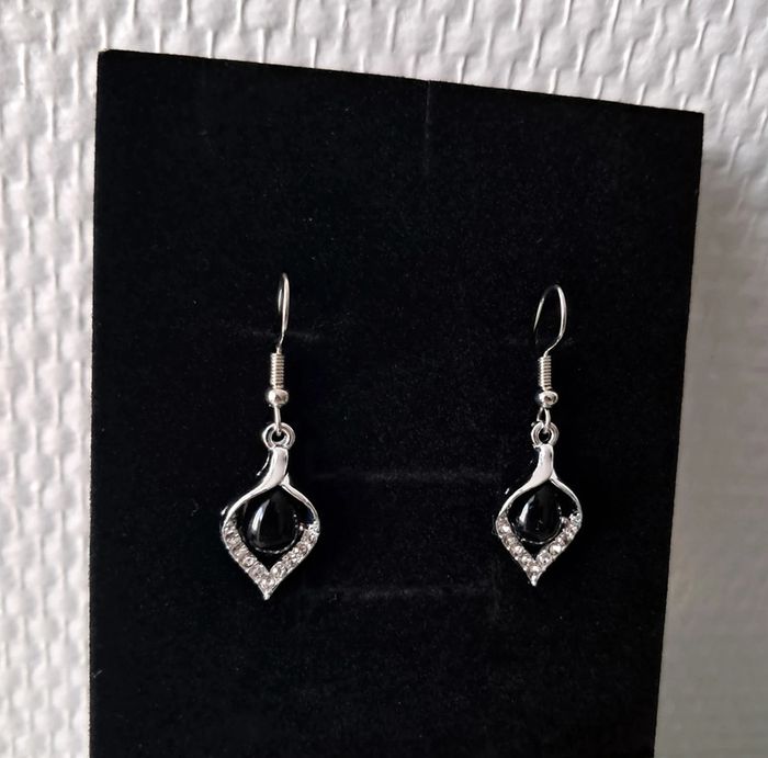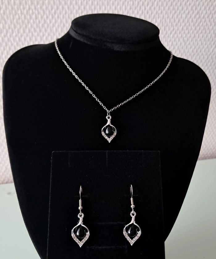 Collier et boucles d'oreilles argenté avec strass et goute noire Collier 45cm+5 Neuf J'offre un pochon doux Envoi rapide et soigné