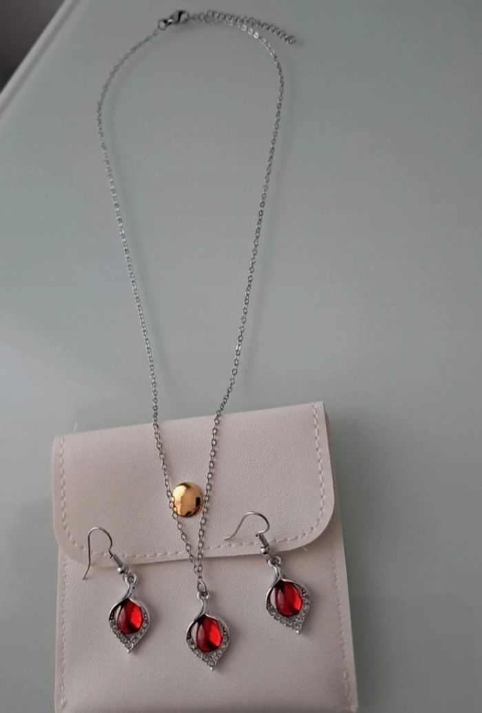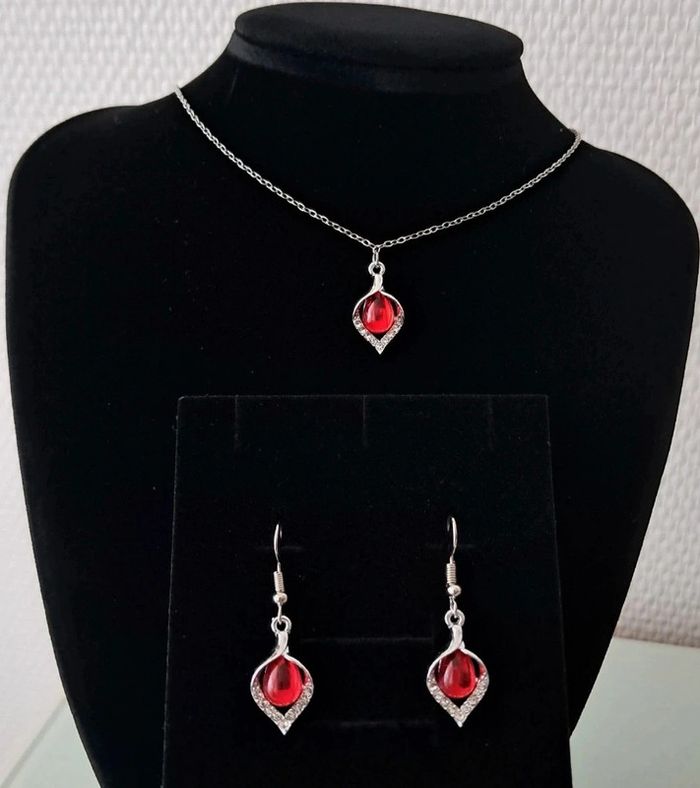 Parure argenté avec goute rouge et strass - photo numéro 2