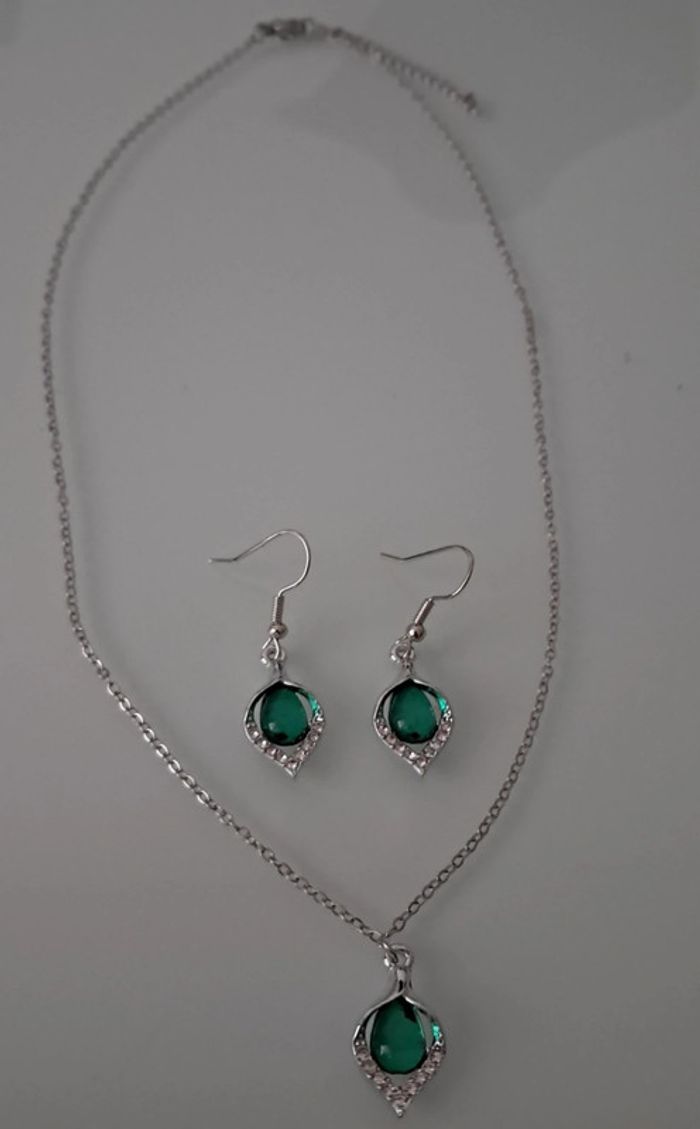 Collier 43cm+5 + boucles d'oreille argenté avec gouttelettes verte et strass En acier inoxydable Neuf J'offre un pochon