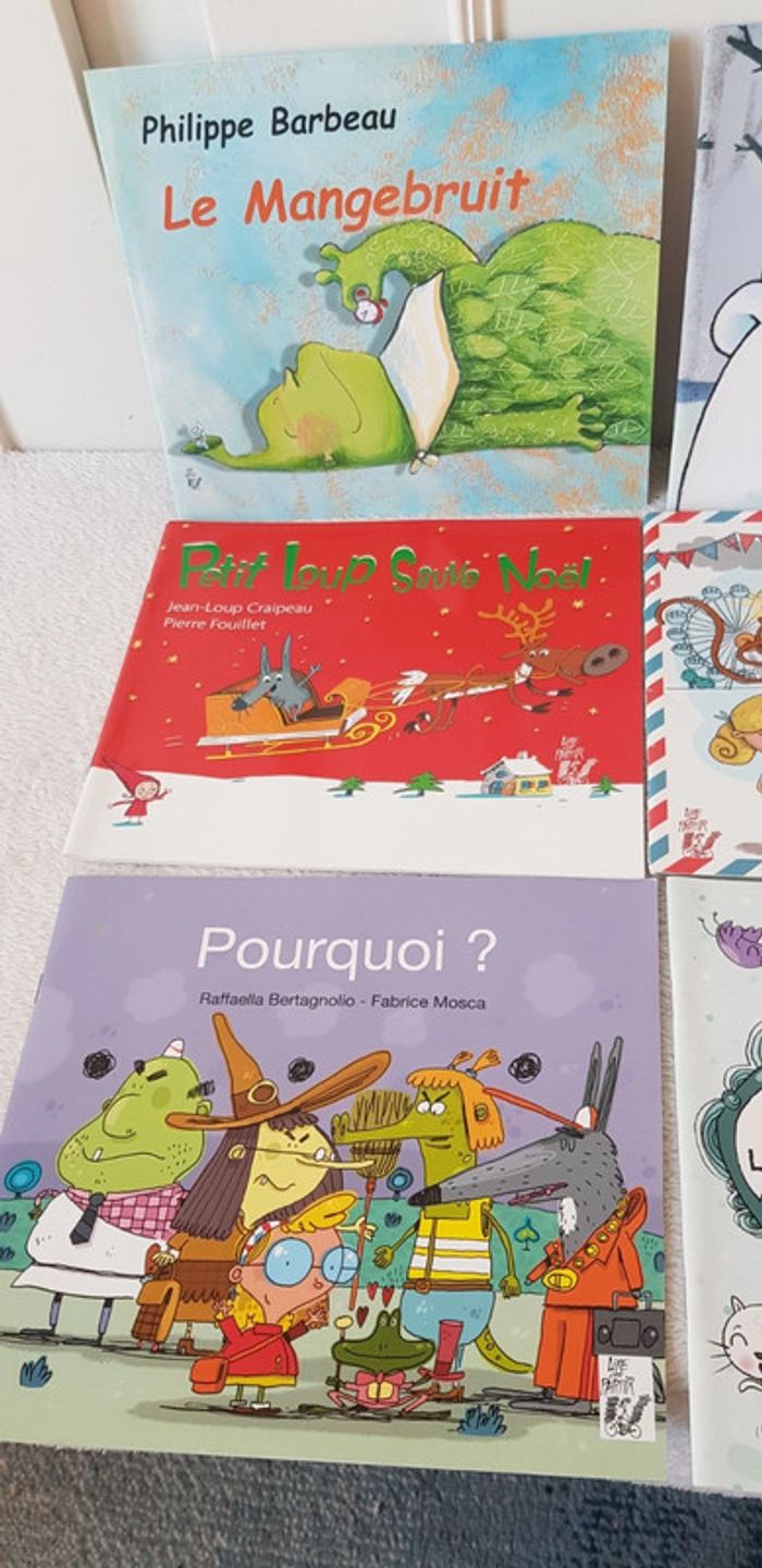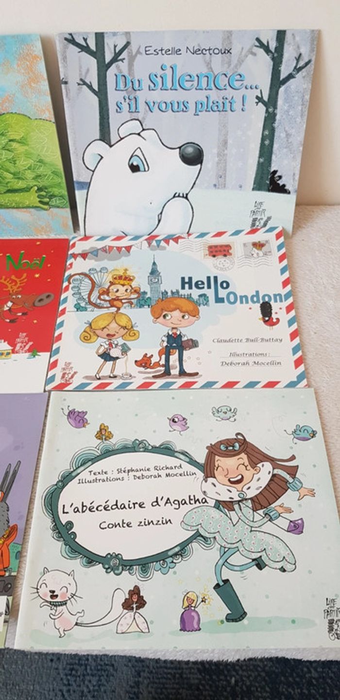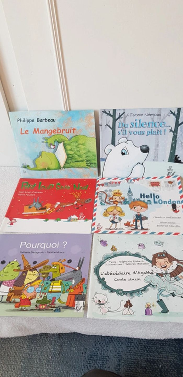 Lot de 6 livres comprenant : le mangebruit, petit loup sauvé Noel, pourquoi ?, du silence... s'il vous plaît !, Hello London, l'abécédaire d'Agathe. Très bon état !
