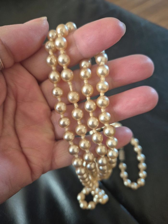 ➡️mes autres annonces de bijoux et accessoires👉 #cg89bijoux 😁réductions activées des 2 articles ! un sautoir ou collier de perles beiges. quelques sont éraflées. Il mesure 57 cm de longueur, on peut faire 2 tours. bon état #sautoir #perle #collier #bijoux