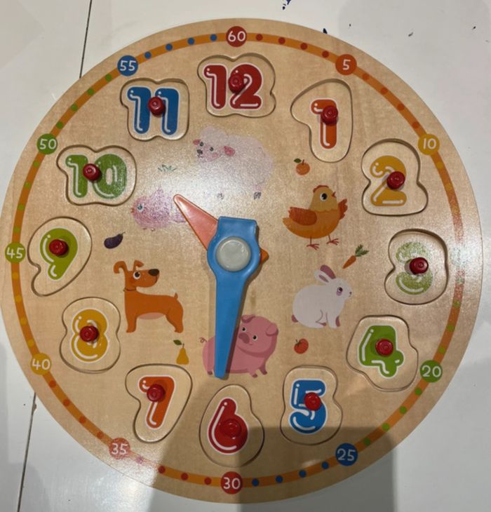 Jeu en bois, pour apprendre l’heure et les chiffres.