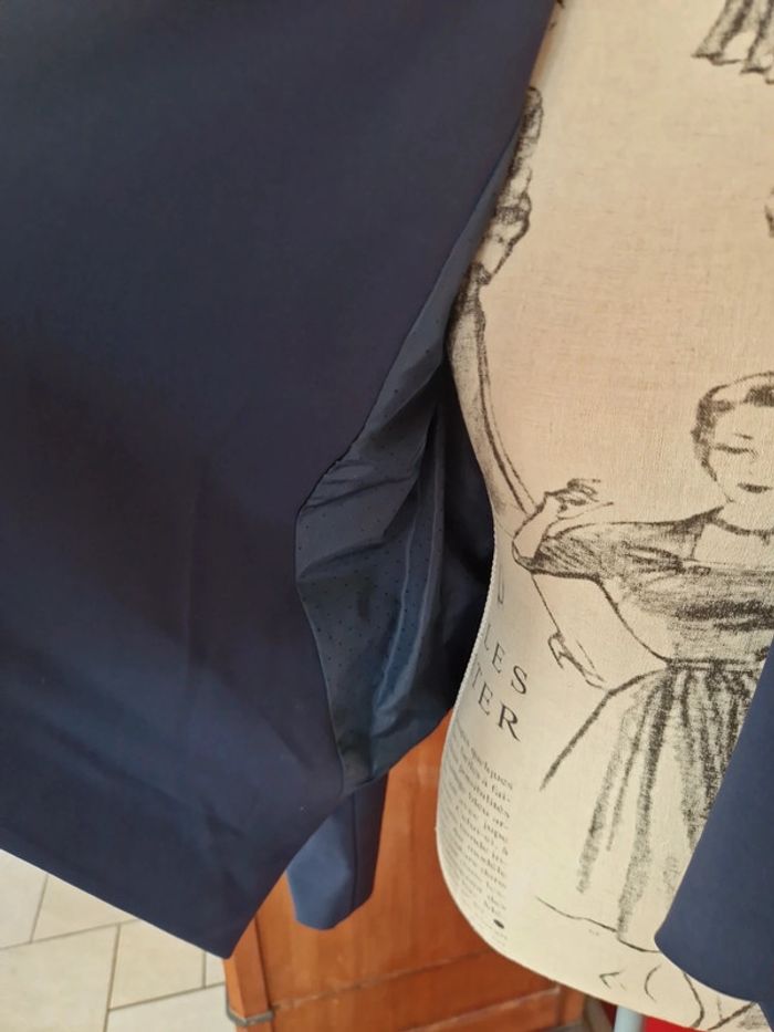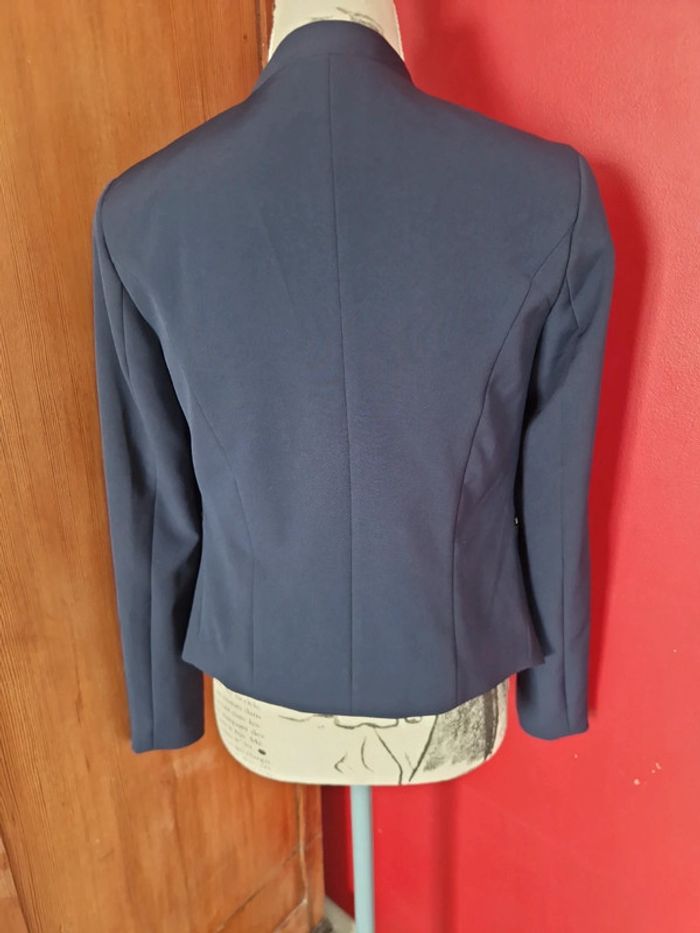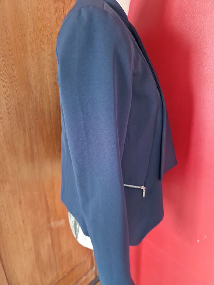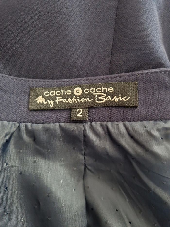 Veste bleue marine, avec épaulettes, 2 fausses poches zippées, taille 2, de la marque Cache Cache, en très bon état