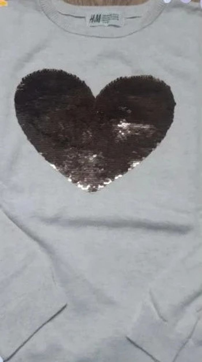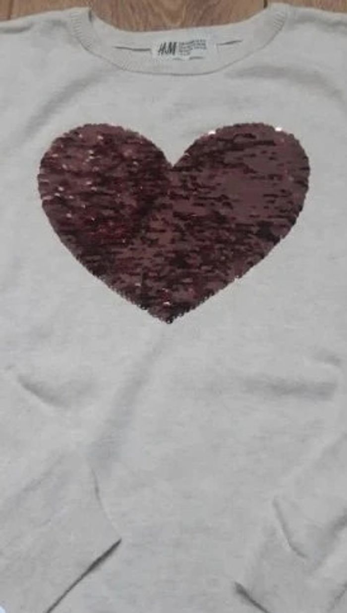 Pull fin h&m 134/140 cm beige chiné cœur séquins réversibles neuf jamais porté - photo numéro 1